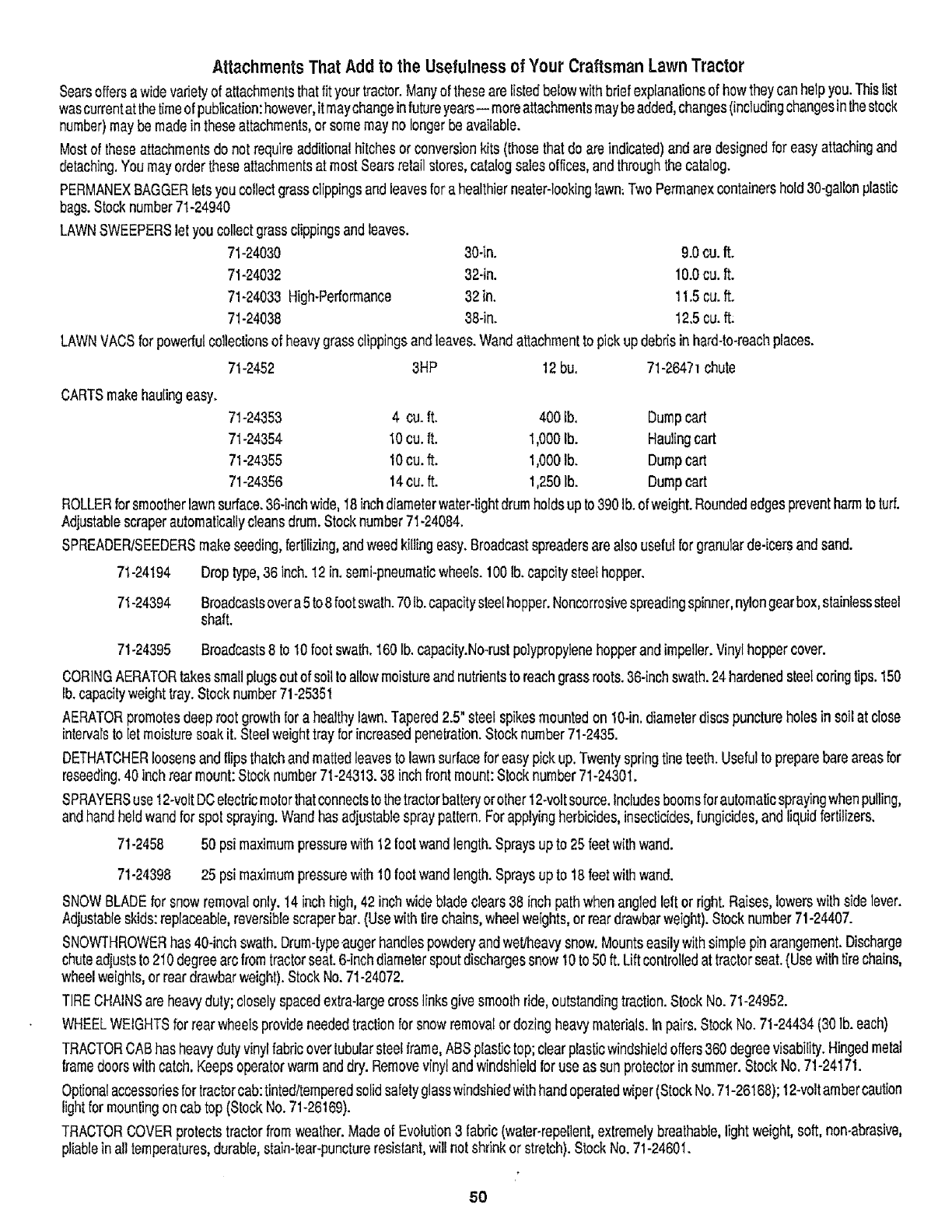 Searsoffersawidevarietyof attachmentsthatfityour tractor.Manyof theseare listedbelowwithbriefexpfanationsofhowtheycan helpyou.Thislist