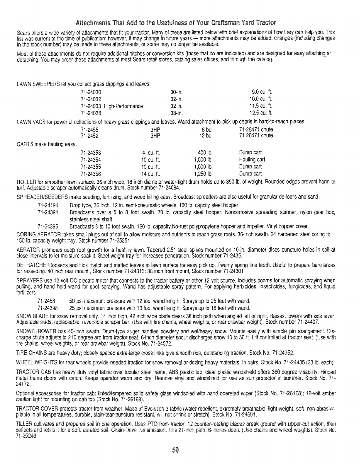 Sears offersa wide varietyof attachmentsthatfityour tractor.Manyof thesearelistedbelowwithbrief explanationsof how theycan helpyou.This