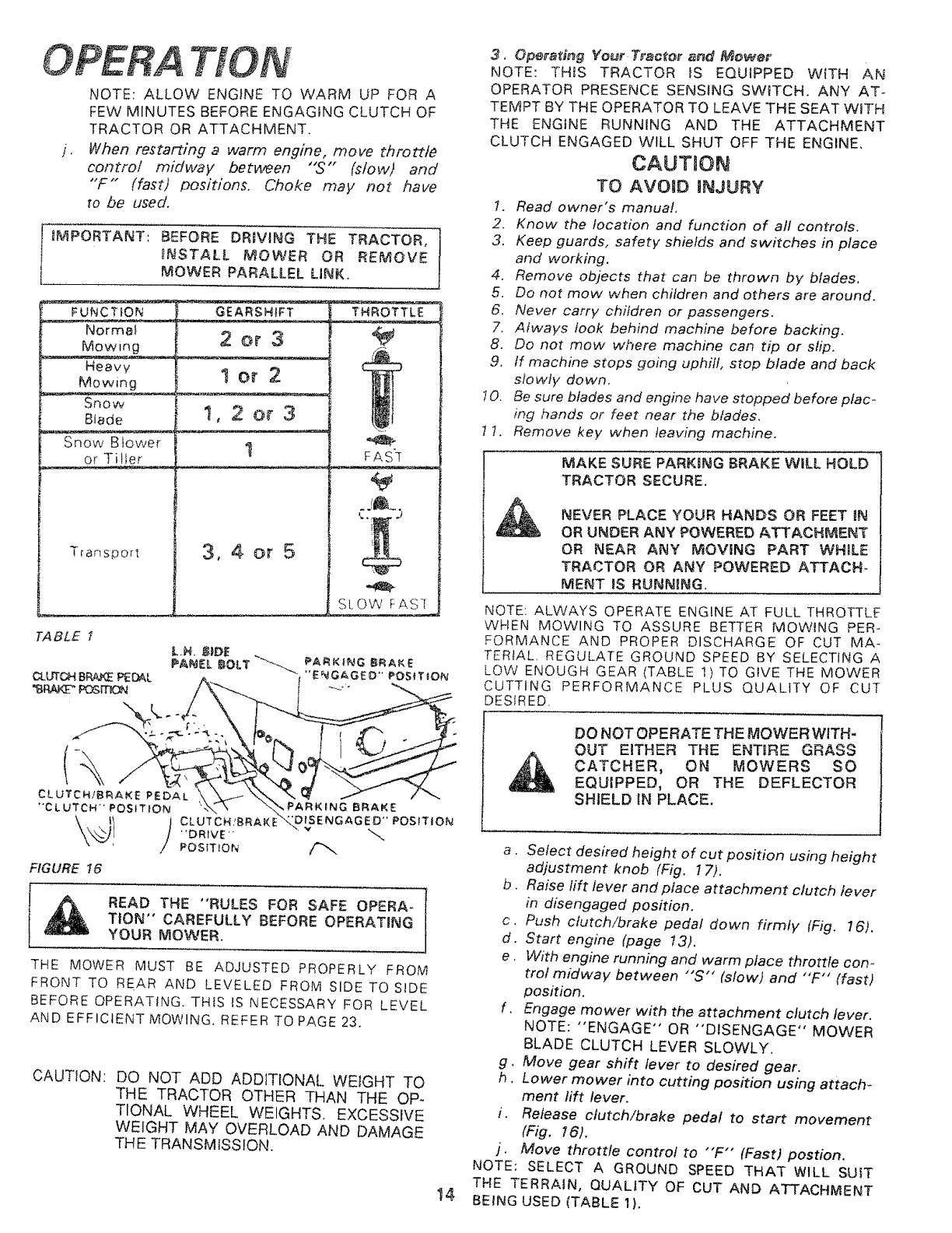 tachments, shift into neutral, set the parking brake, stop