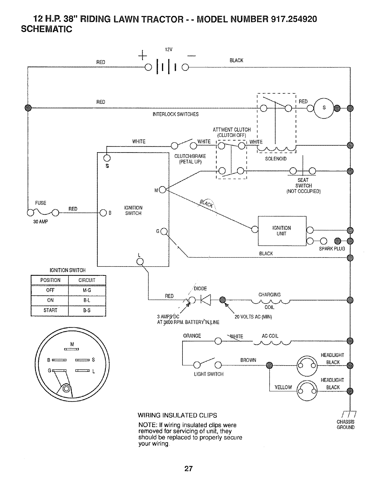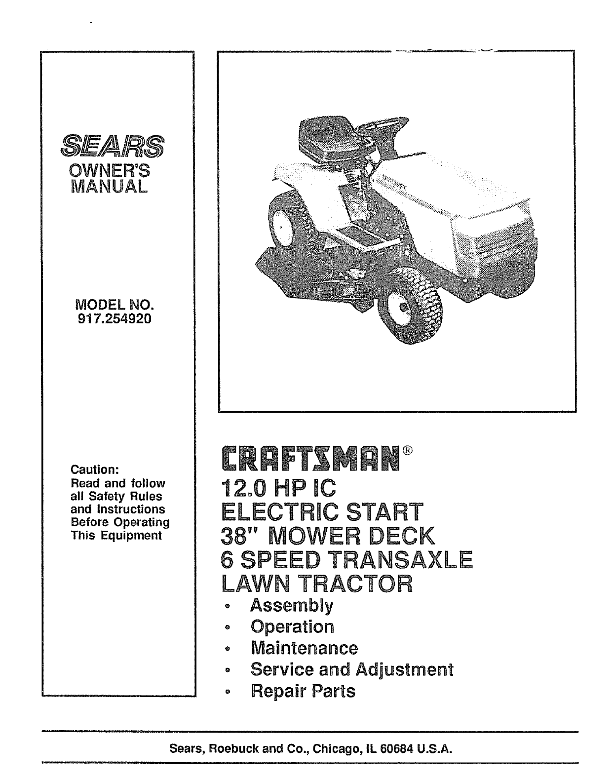 12 H.P. 38" RIDING LAWN TRACTOR - -MODEL NUMBER 917.254920