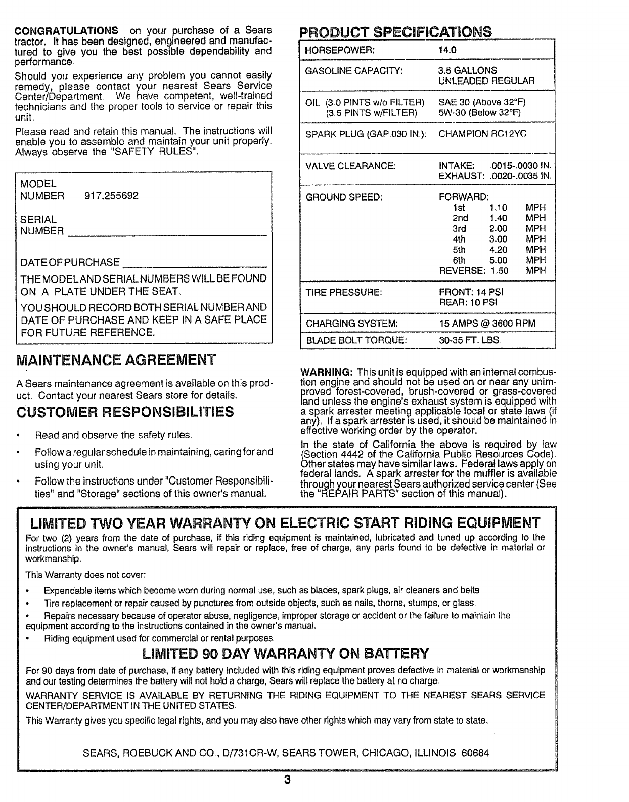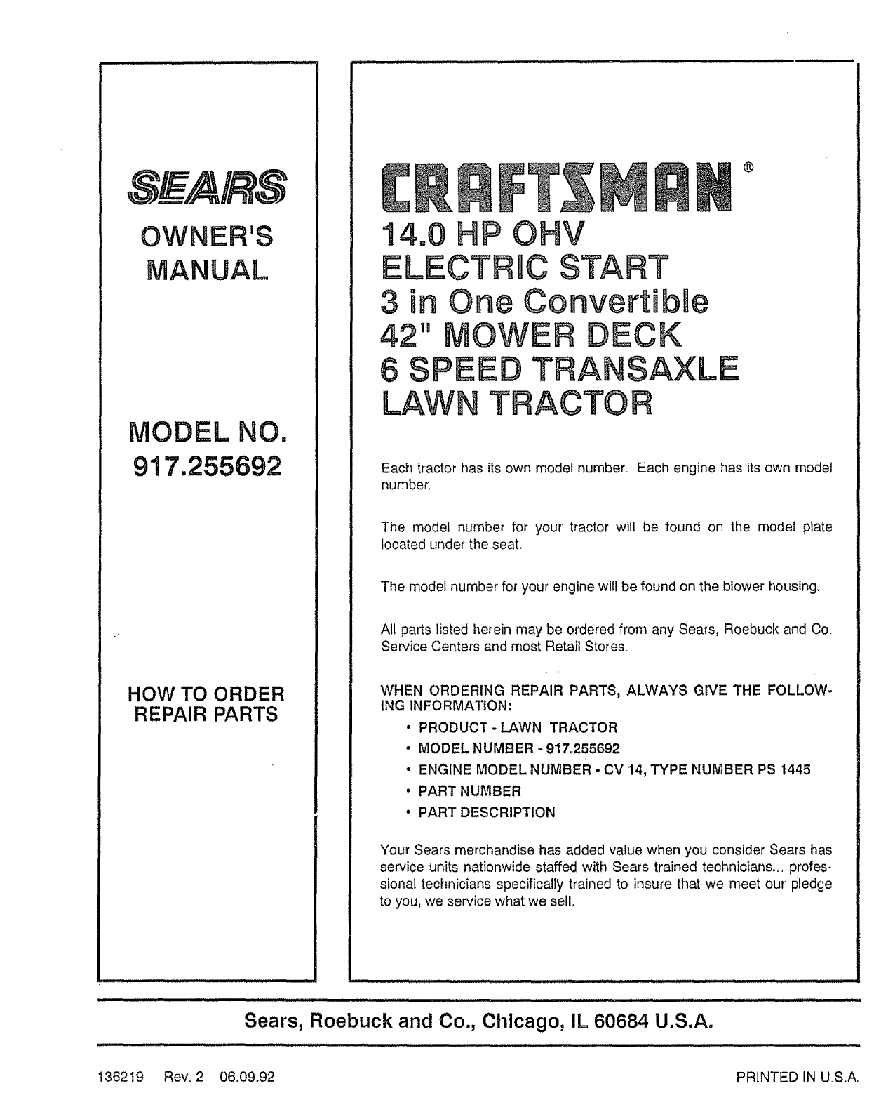 User Manual: Craftsman 917255692 917255692 CRAFTSMAN Lawn, Tractor - Manuals and Guides View the owners manual for your CRAFTSMAN Lawn, Tractor #917255692. Home:Lawn & Garden Parts:Craftsman Parts:Craftsman Lawn, Tractor Manual