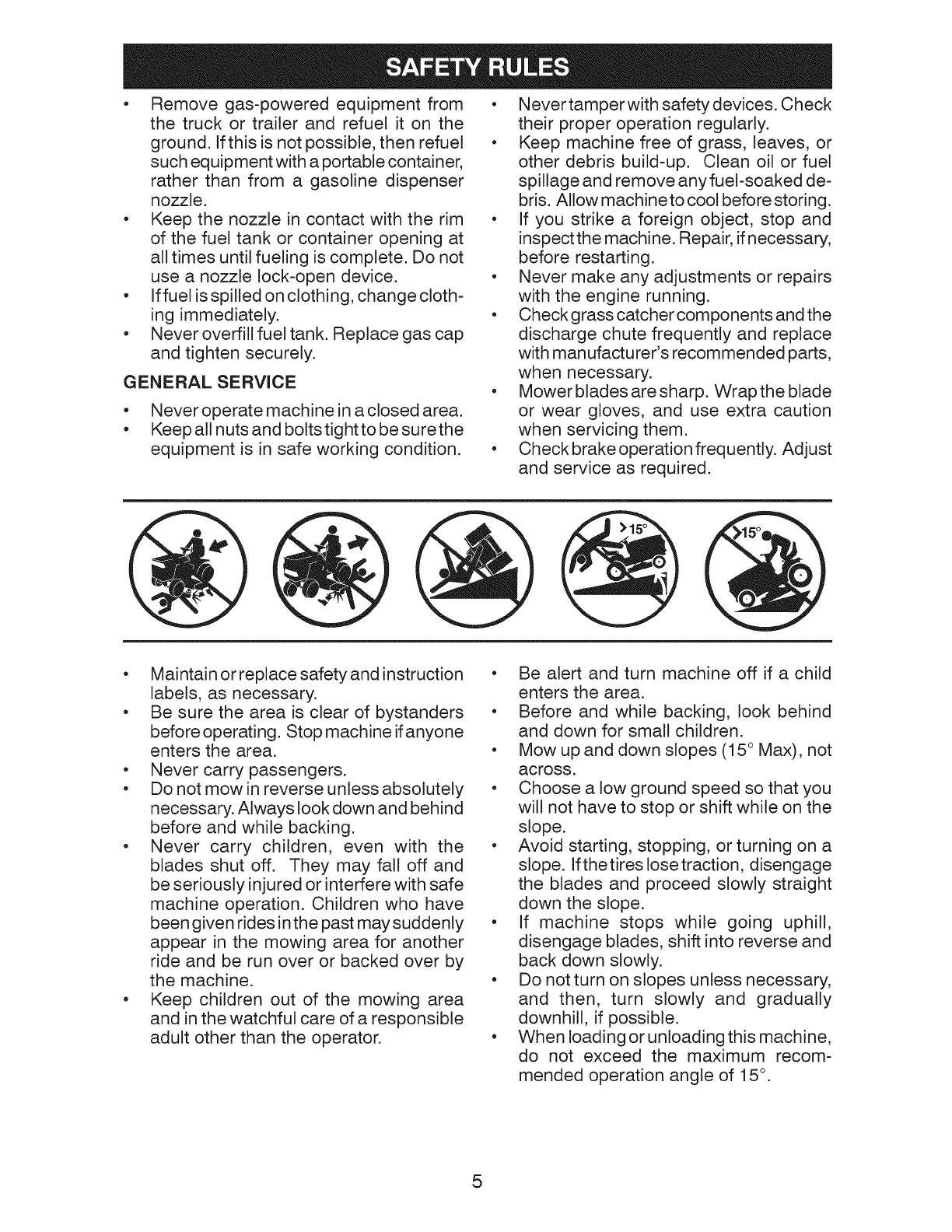 down the face of slopes, never across the face. Do not mow