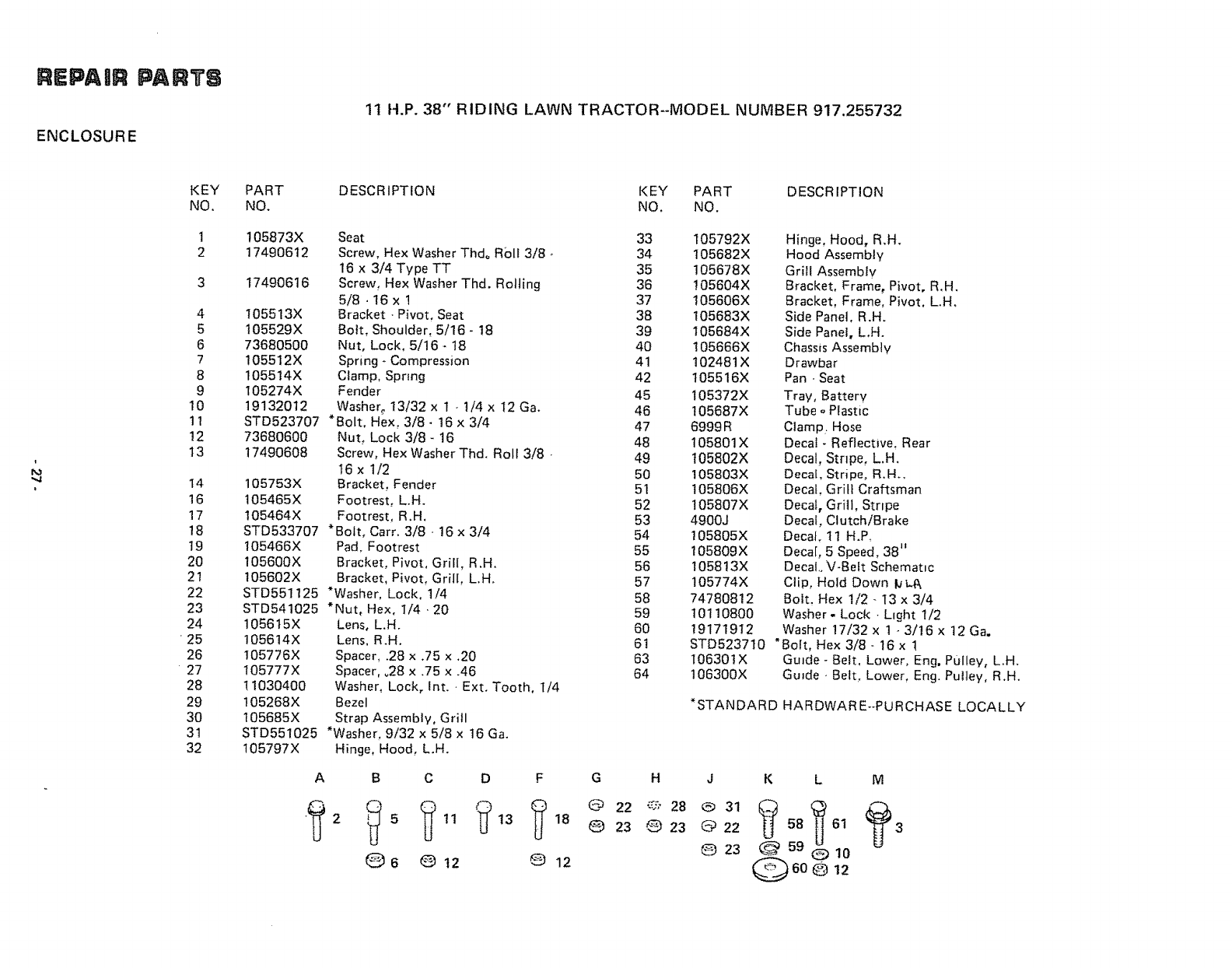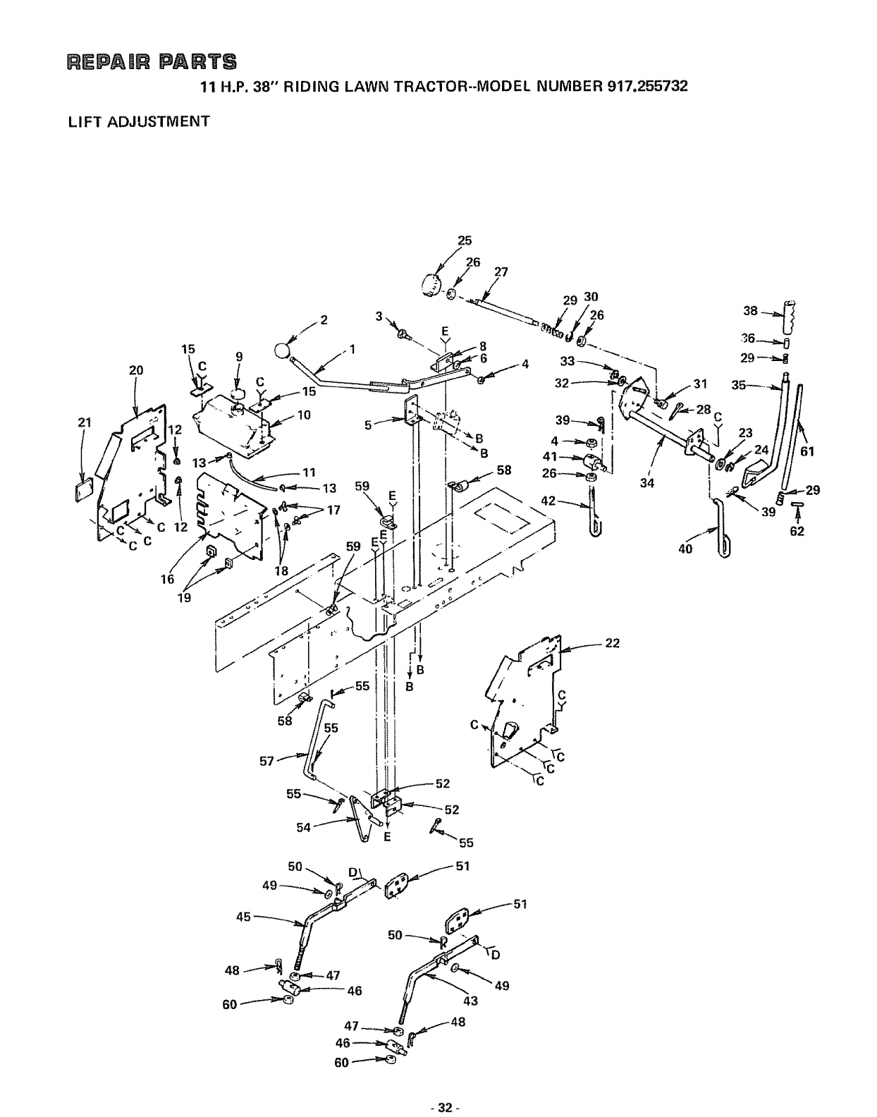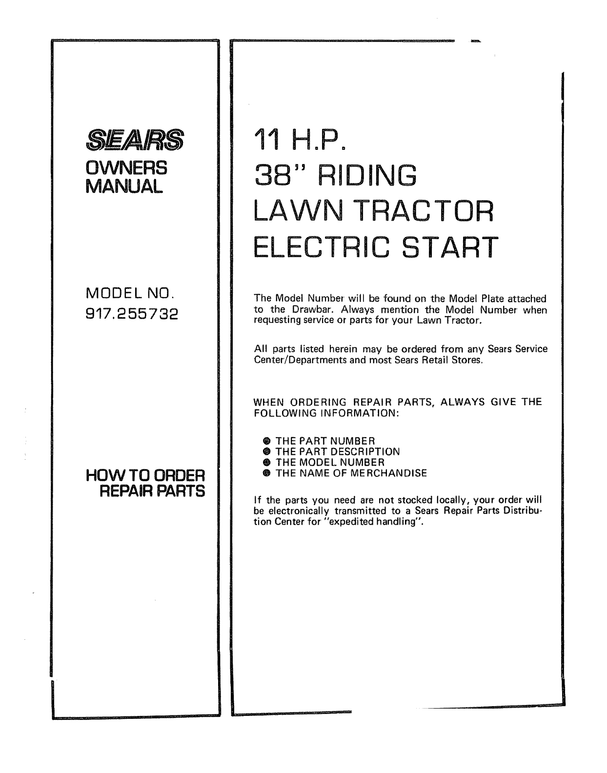 User Manual: Craftsman 917255732 917255732 CRAFTSMAN CRAFTSMAN 11 H.P. 38 INCH RIDING LAWN TRACTOR - Manuals and Guides View the owners manual for your CRAFTSMAN CRAFTSMAN 11 H.P. 38 INCH RIDING LAWN TRACTOR #917255732. Home:Lawn & Garden Parts:Craftsman Parts:Craftsman CRAFTSMAN 11 H.P. 38 INCH RIDING LAWN TRACTOR Manual