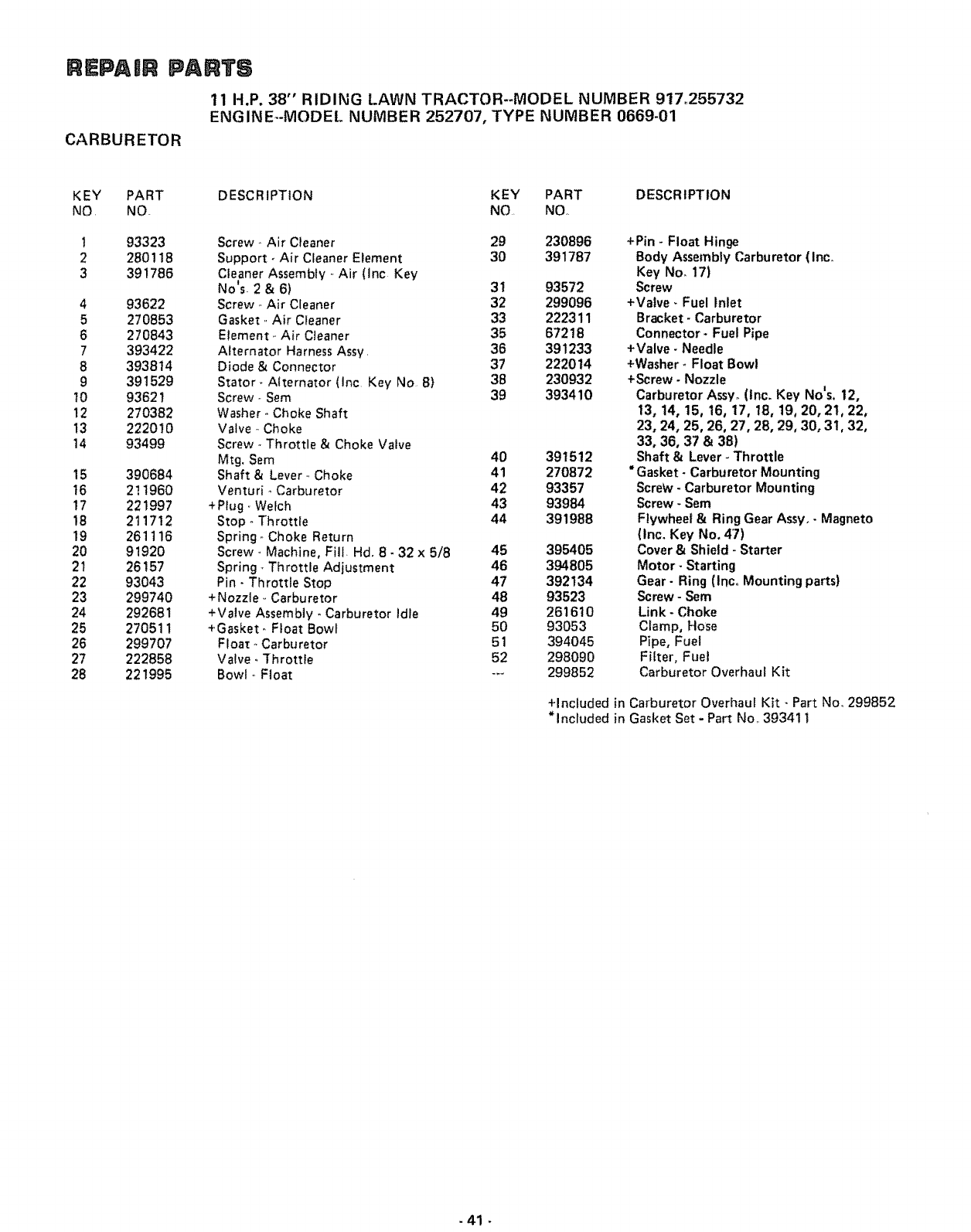 +Included in Carburetor Overhaul Kit - Part No, 299852
