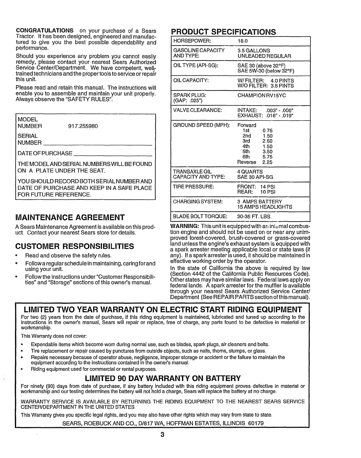 User Manual: Craftsman 917255980 917255980 CRAFTSMAN Lawn, Tractor - Manuals and Guides View the owners manual for your CRAFTSMAN Lawn, Tractor #917255980. Home:Lawn & Garden Parts:Craftsman Parts:Craftsman Lawn, Tractor Manual