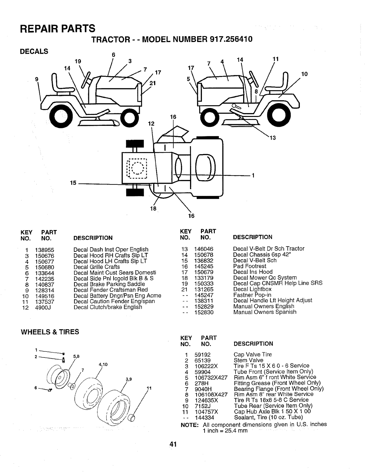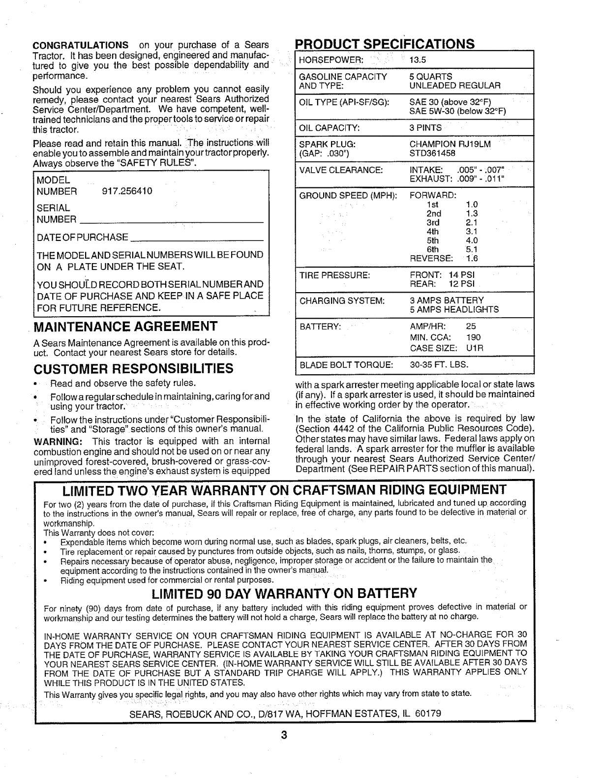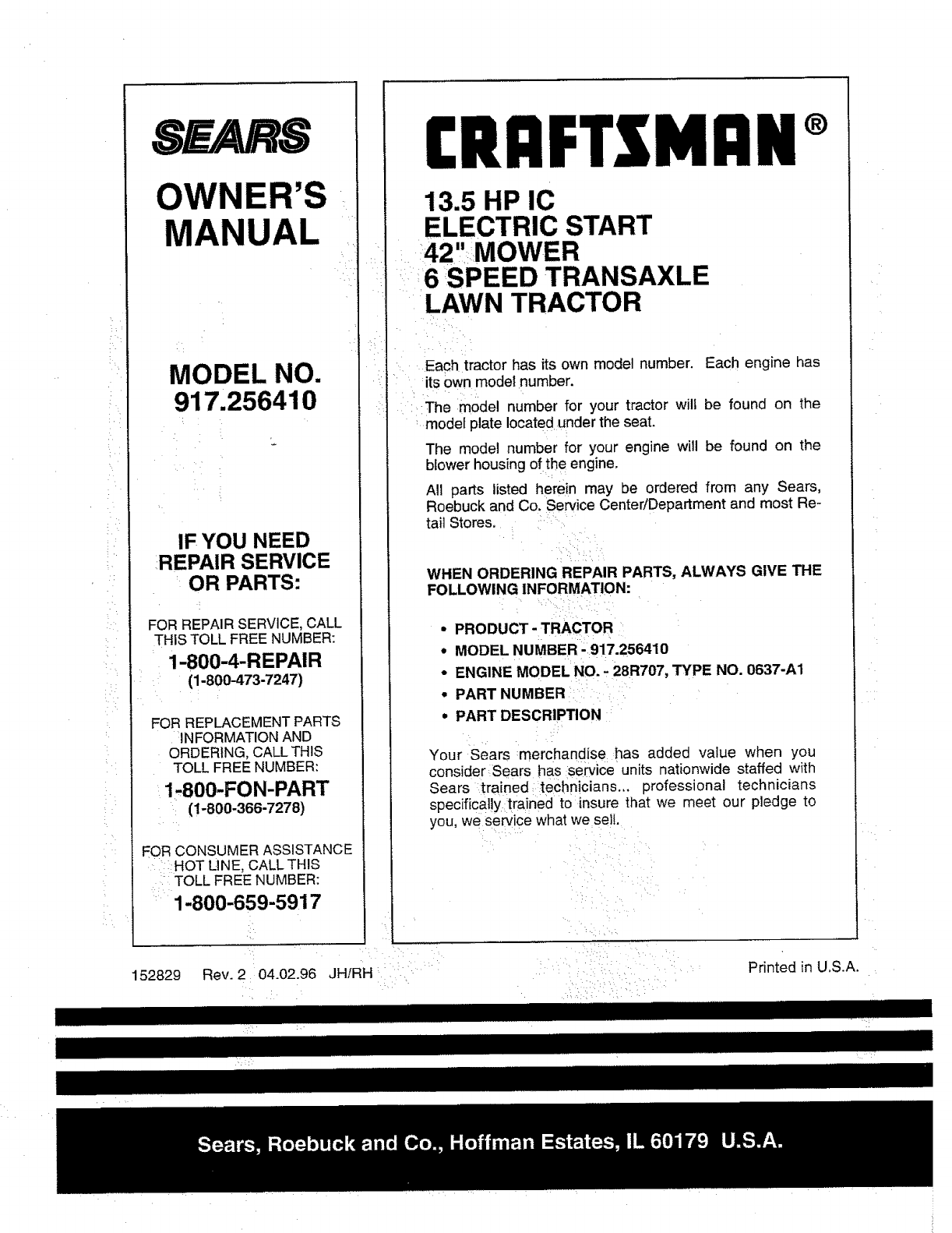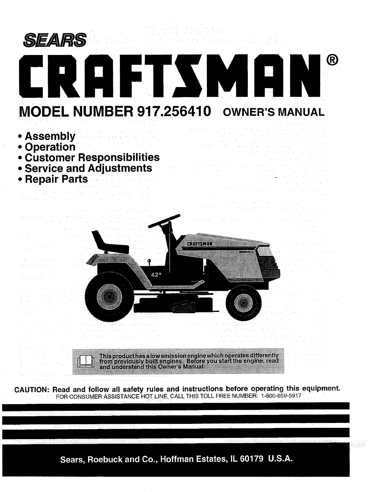 User Manual: Craftsman 917256410 917256410 CRAFTSMAN TRACTOR - Manuals and Guides View the owners manual for your CRAFTSMAN TRACTOR #917256410. Home:Lawn & Garden Parts:Craftsman Parts:Craftsman TRACTOR Manual
