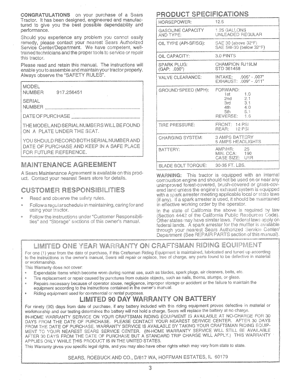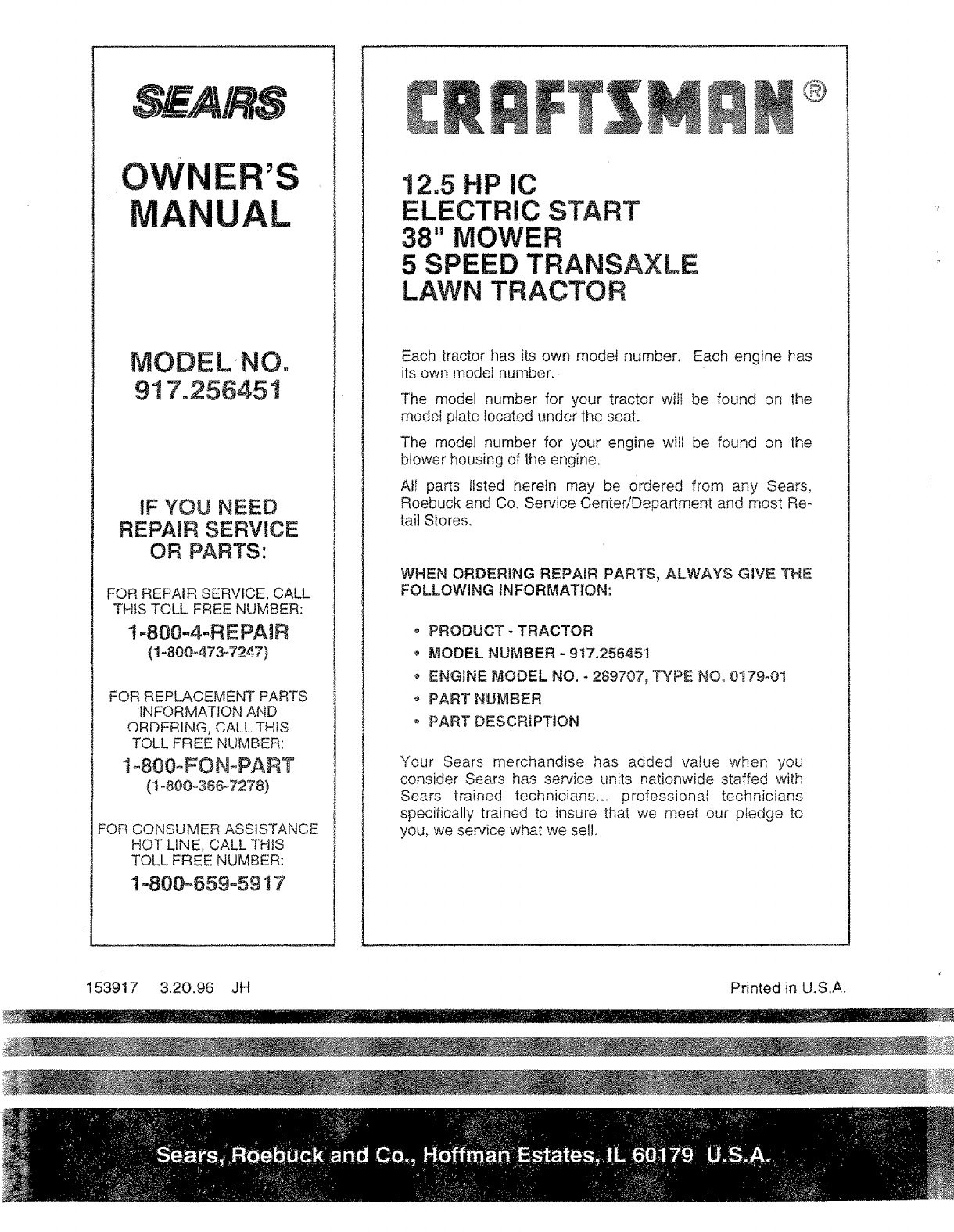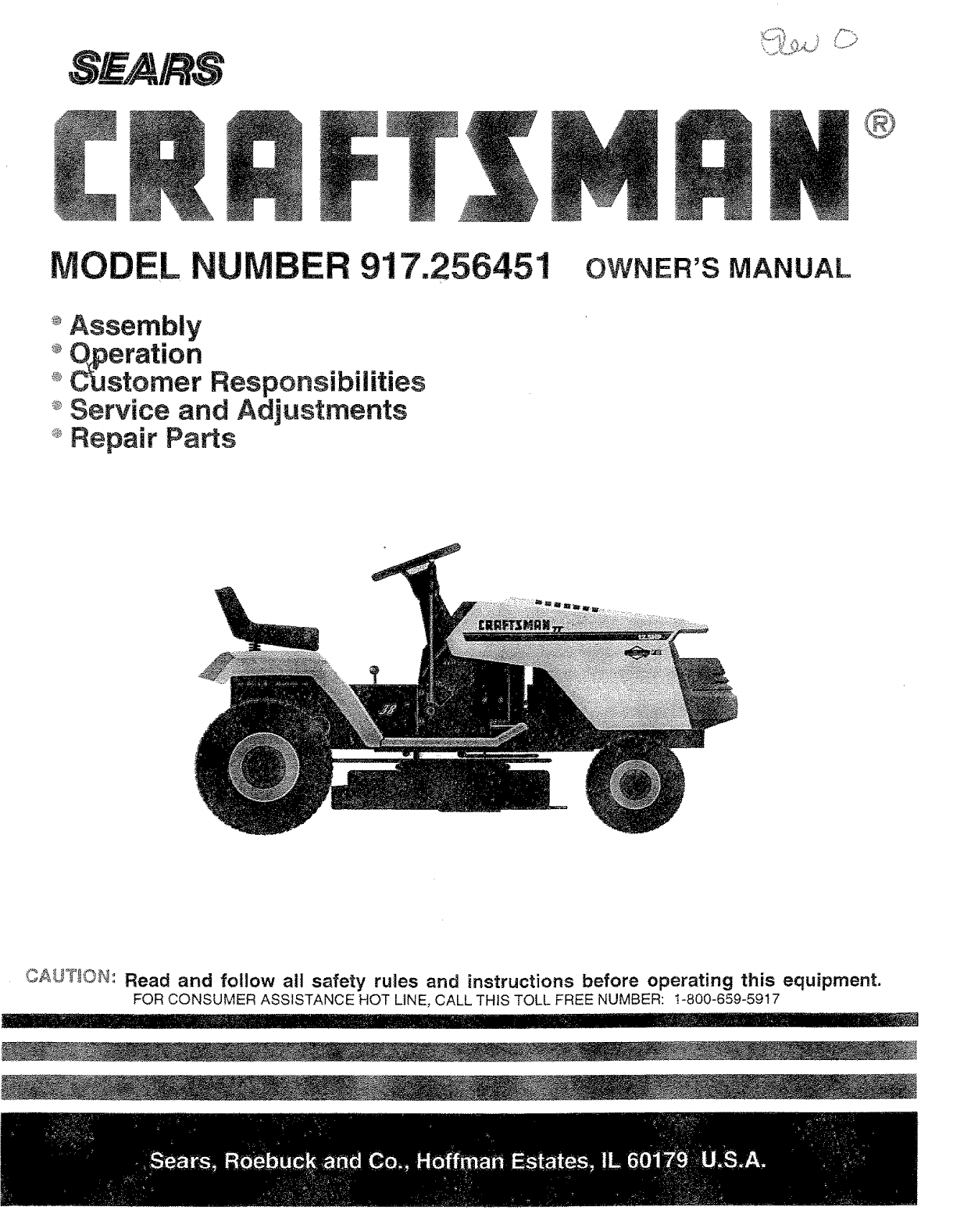 User Manual: Craftsman 917256451 917256451 CRAFTSMAN Lawn, Tractor - Manuals and Guides View the owners manual for your CRAFTSMAN Lawn, Tractor #917256451. Home:Lawn & Garden Parts:Craftsman Parts:Craftsman Lawn, Tractor Manual