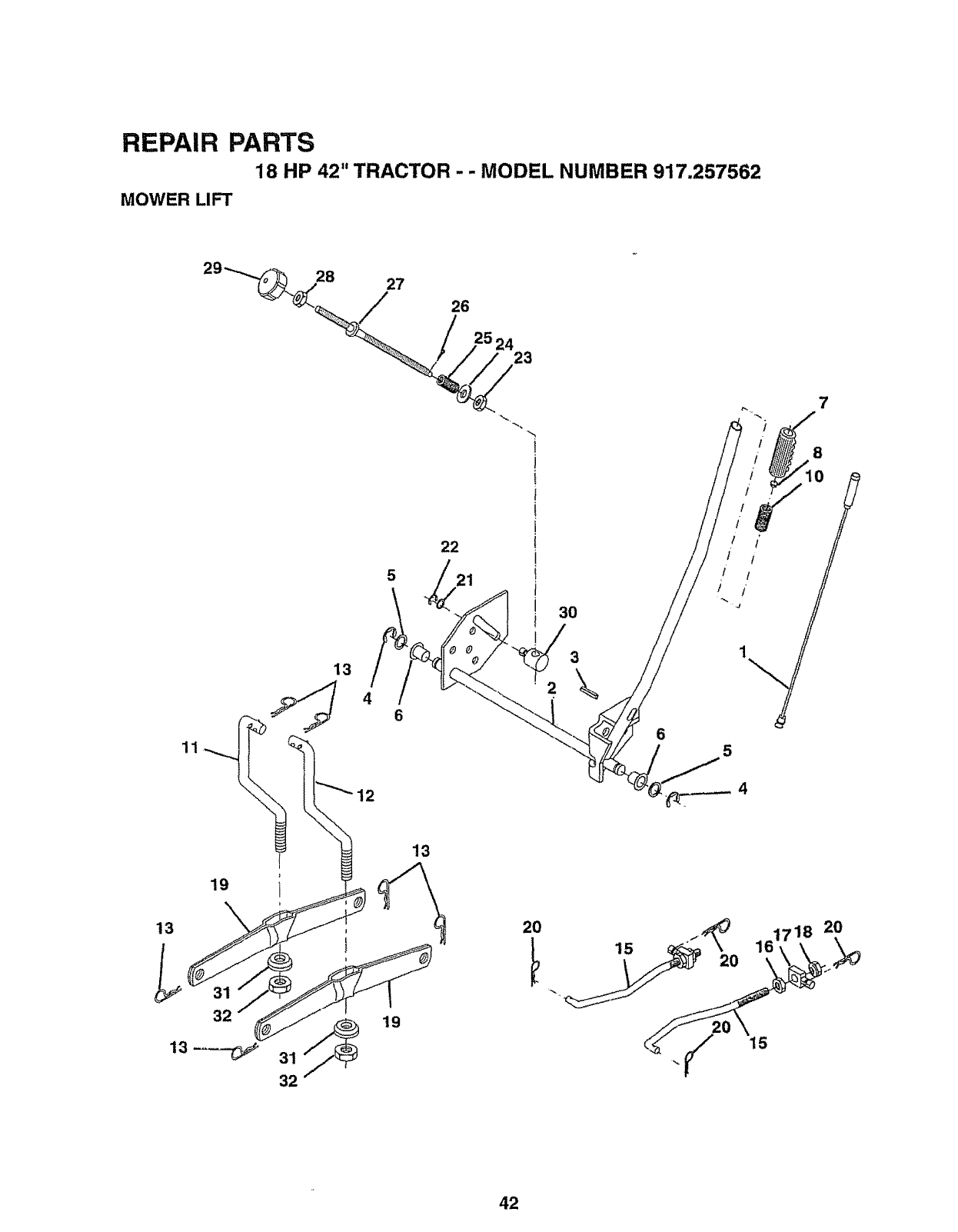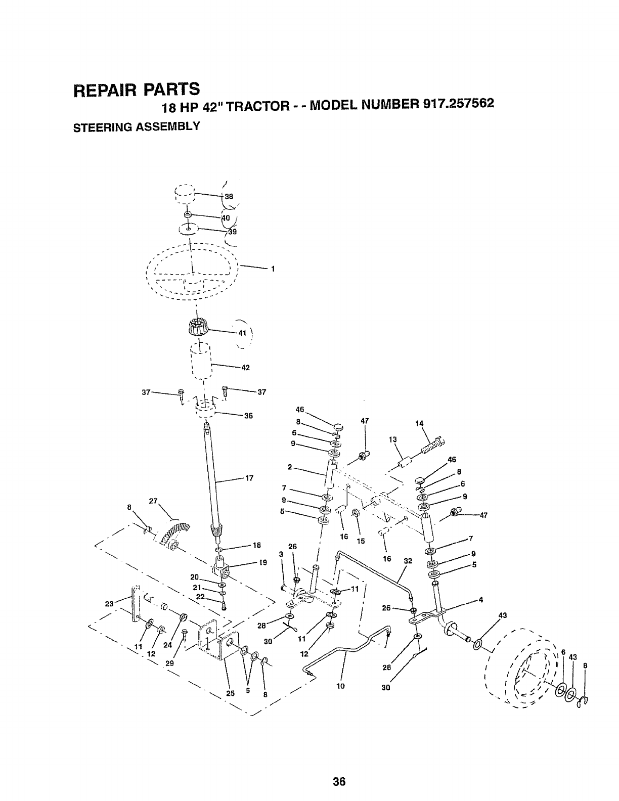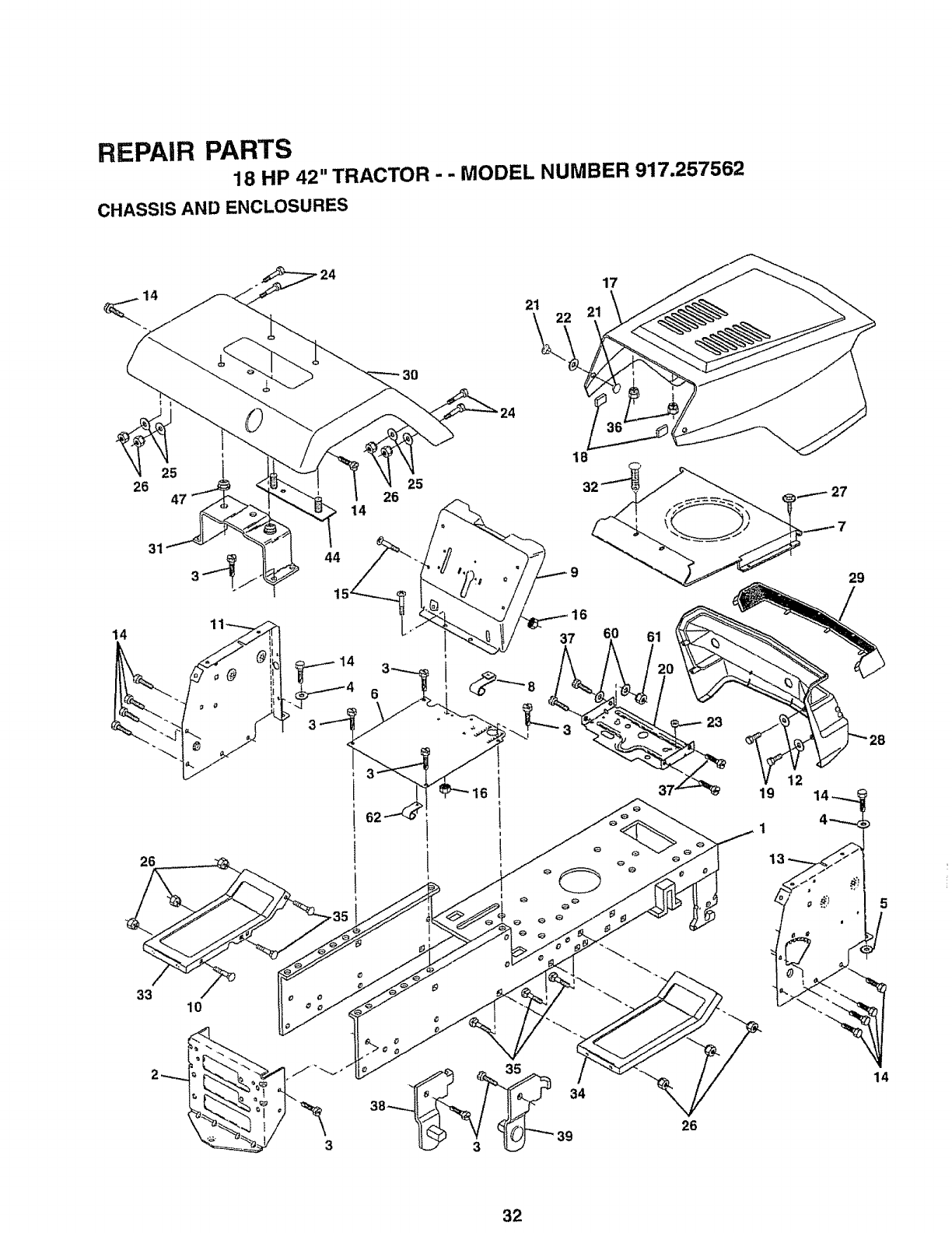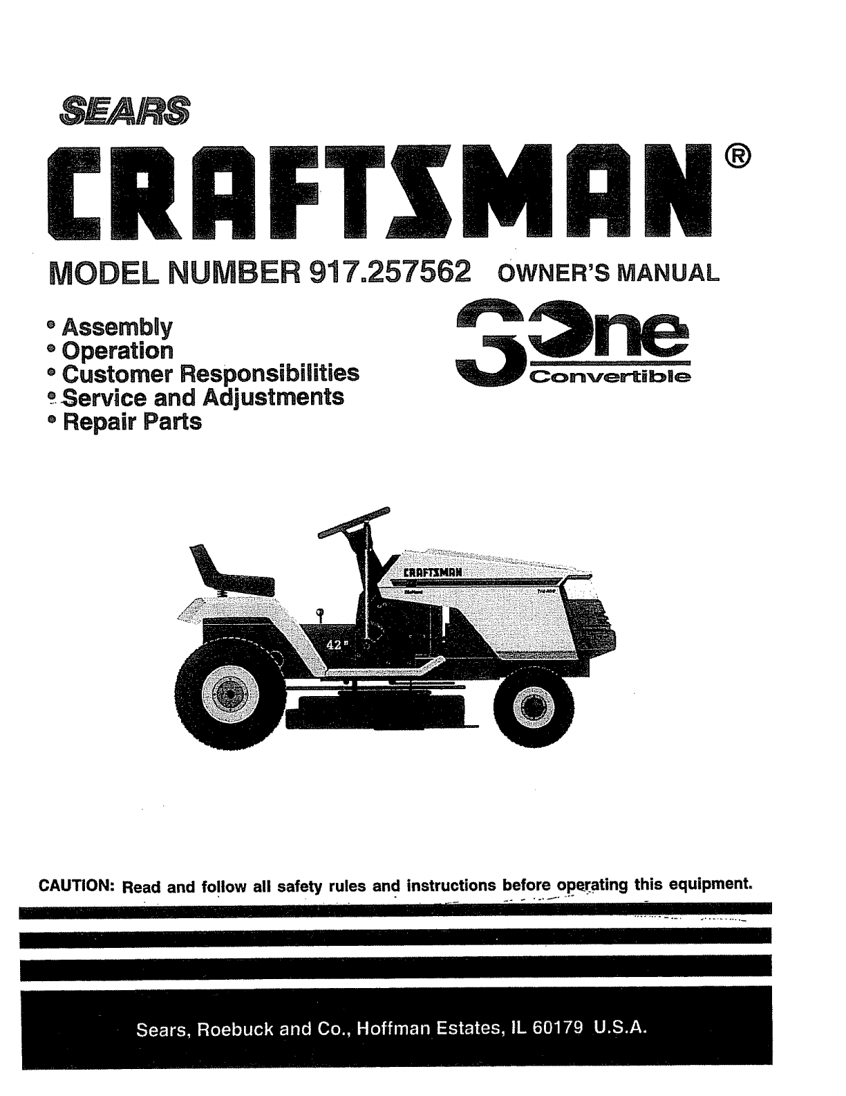 User Manual: Craftsman 917257562 917257562 CRAFTSMAN TRACTOR - Manuals and Guides View the owners manual for your CRAFTSMAN TRACTOR #917257562. Home:Lawn & Garden Parts:Craftsman Parts:Craftsman TRACTOR Manual