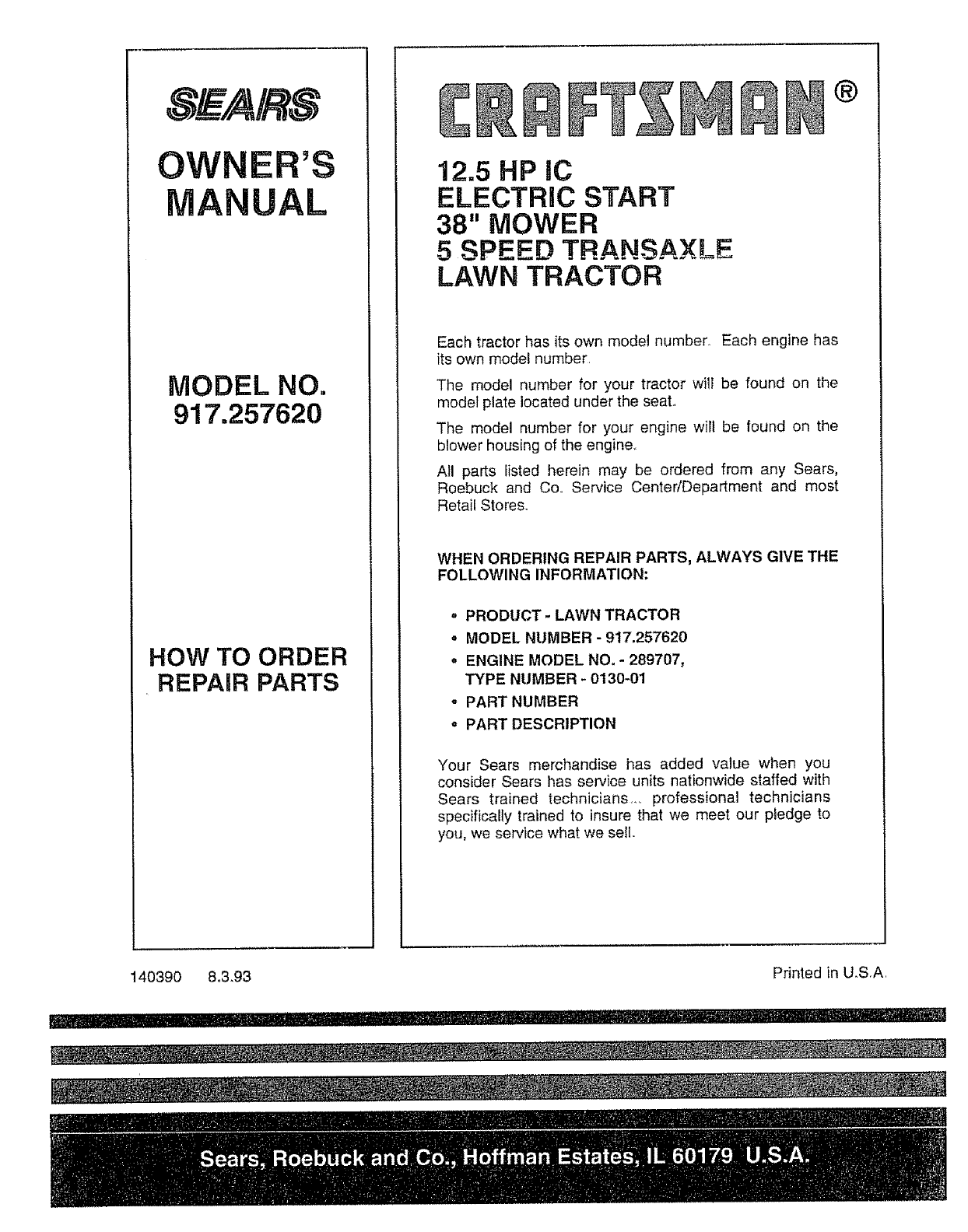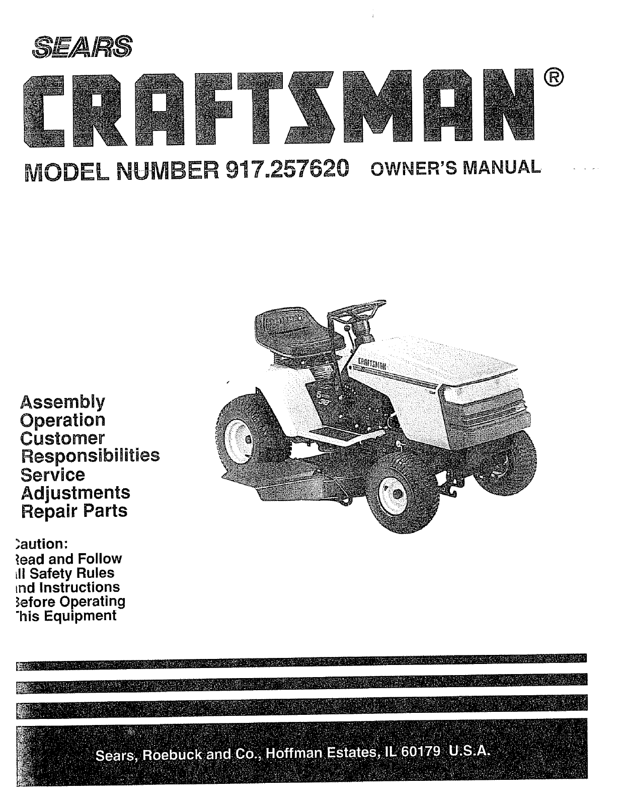User Manual: Craftsman 917257620 917257620 CRAFTSMAN Lawn, Tractor - Manuals and Guides View the owners manual for your CRAFTSMAN Lawn, Tractor #917257620. Home:Lawn & Garden Parts:Craftsman Parts:Craftsman Lawn, Tractor Manual