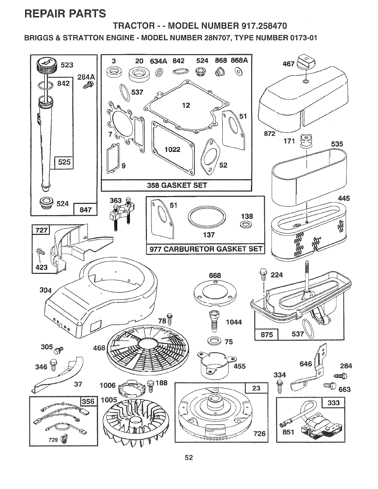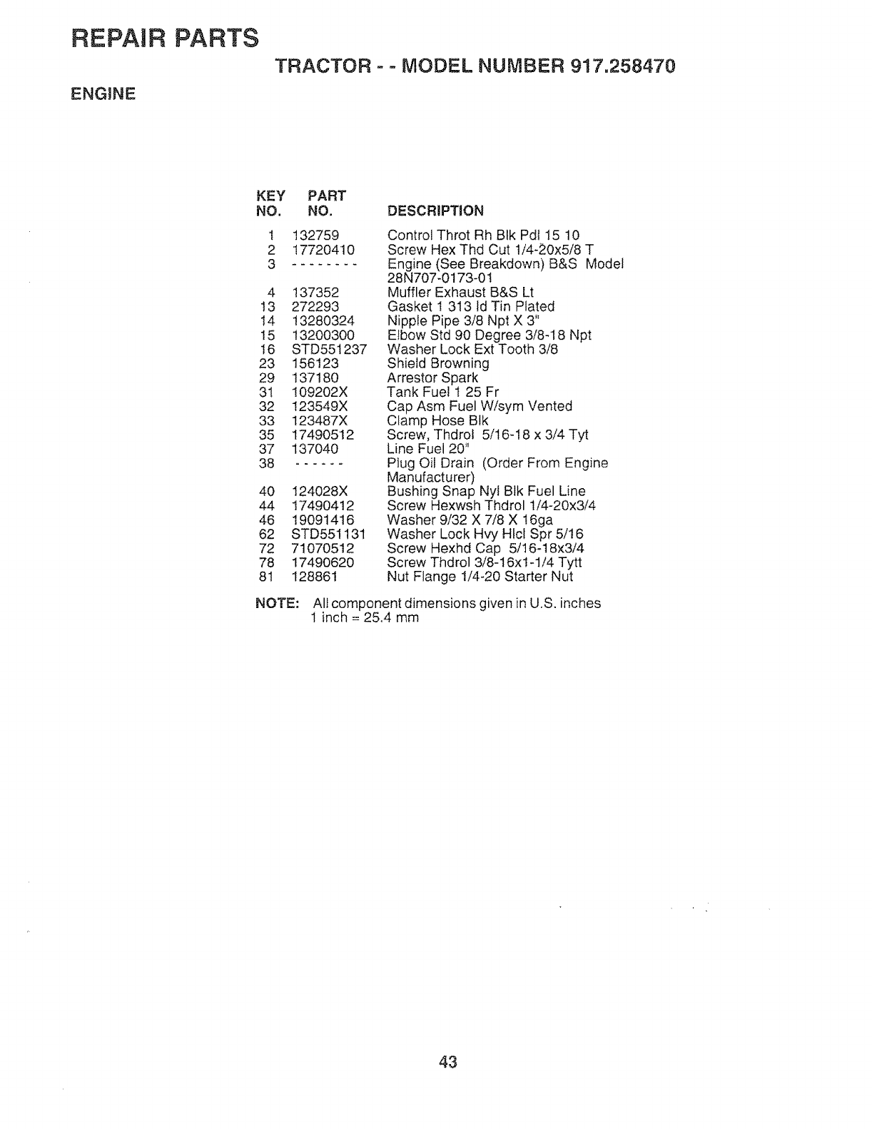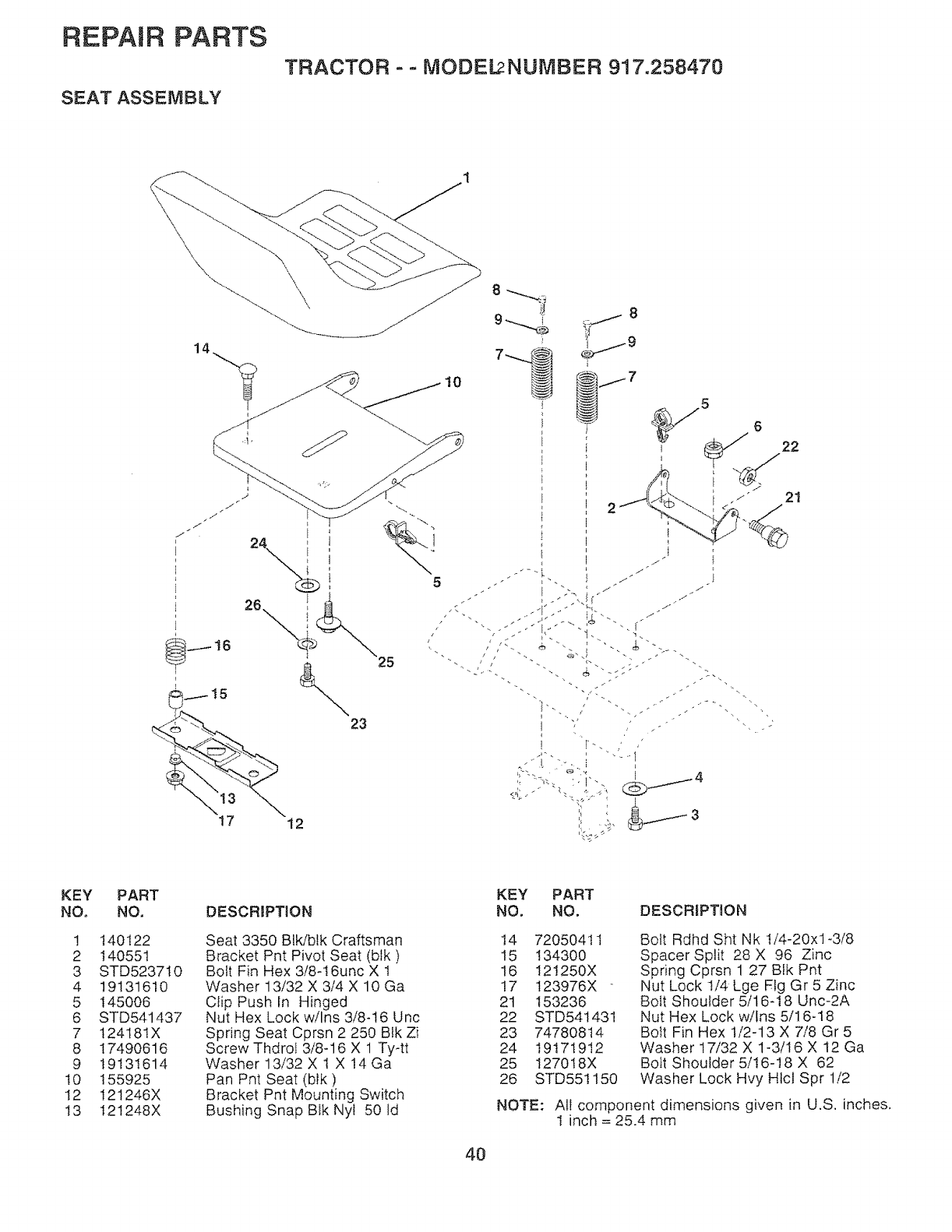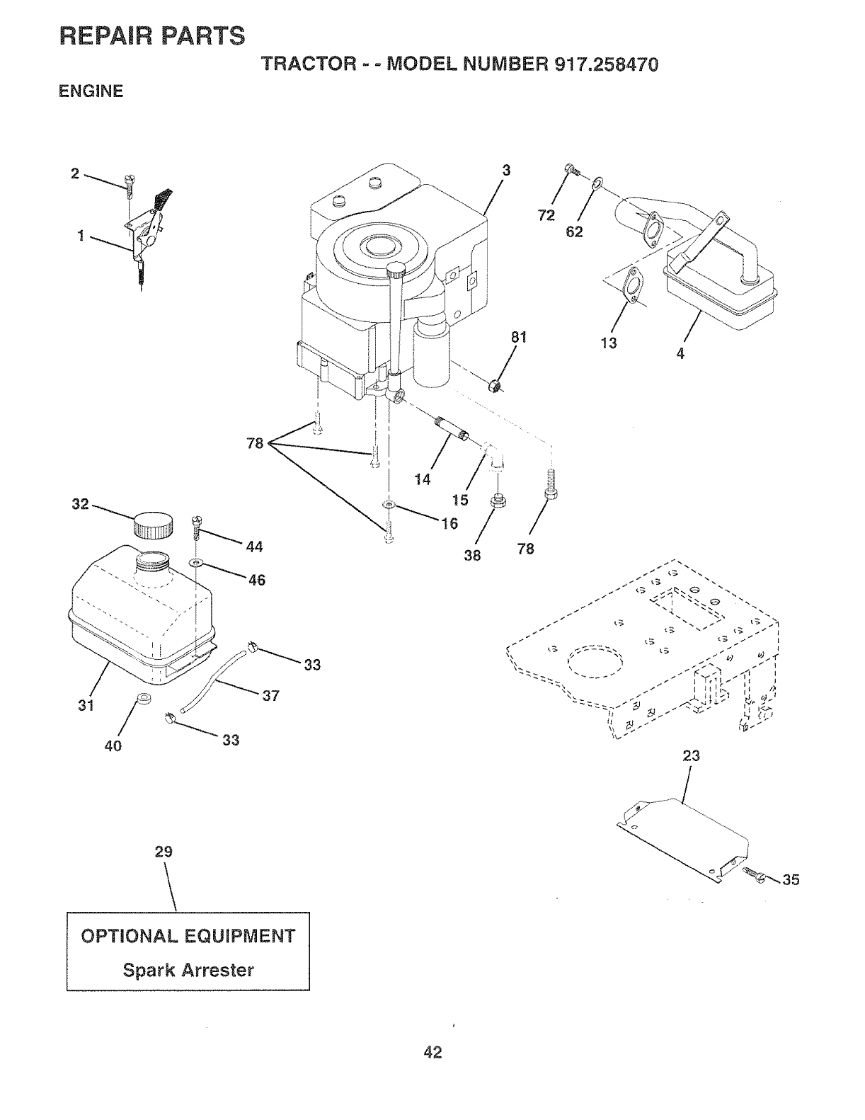 User Manual: Craftsman 917258470 917258470 CRAFTSMAN TRACTOR - Manuals and Guides View the owners manual for your CRAFTSMAN TRACTOR #917258470. Home:Lawn & Garden Parts:Craftsman Parts:Craftsman TRACTOR Manual