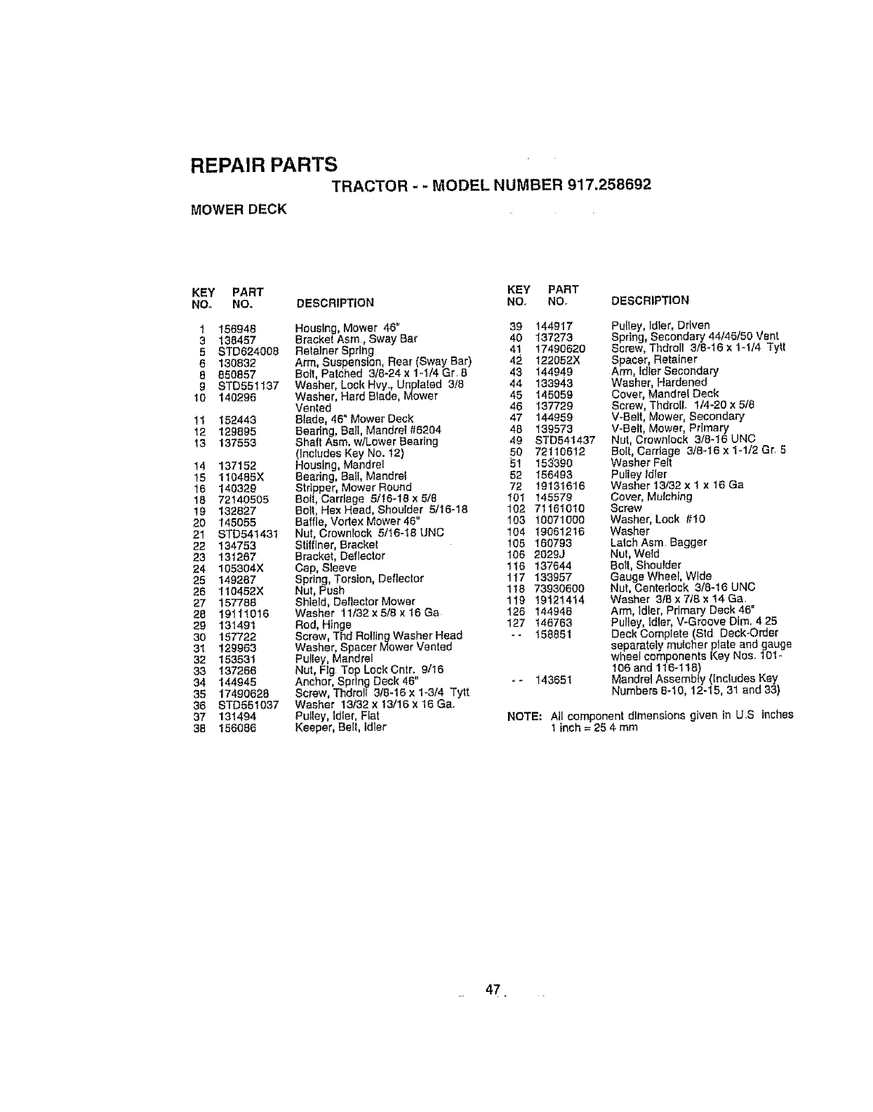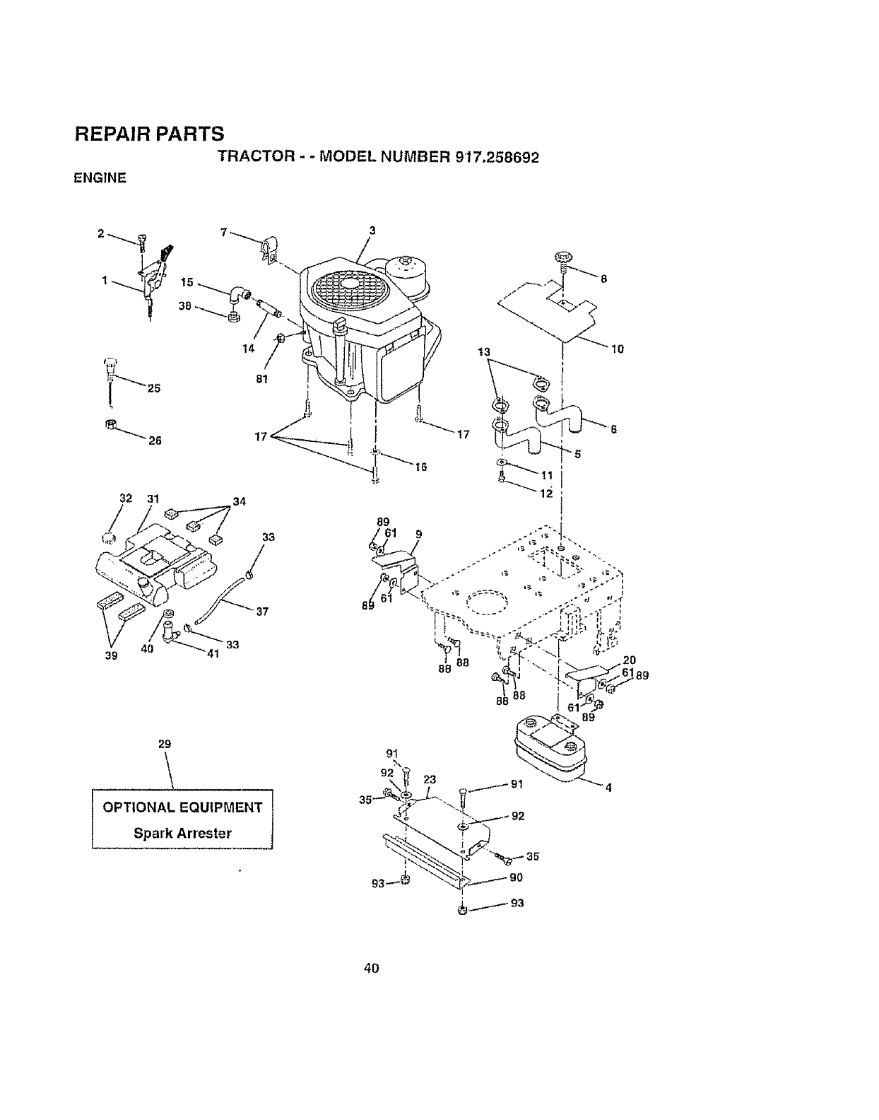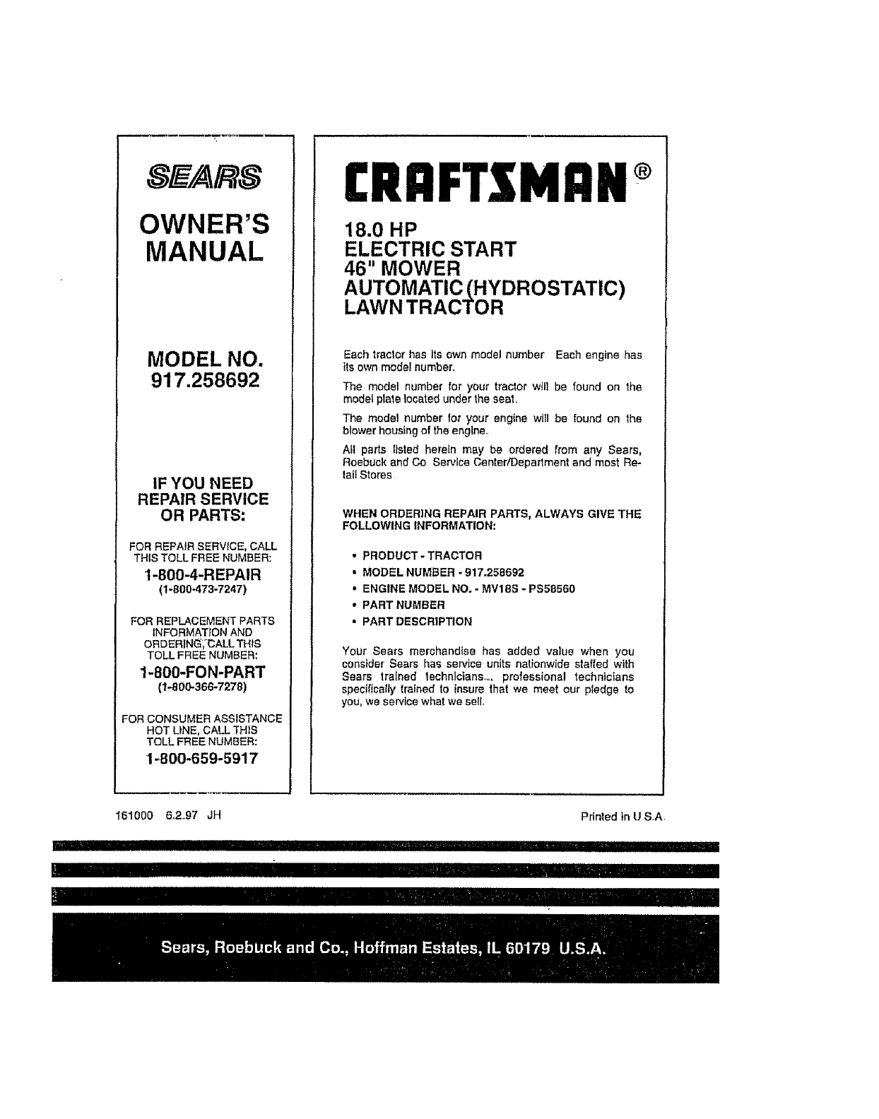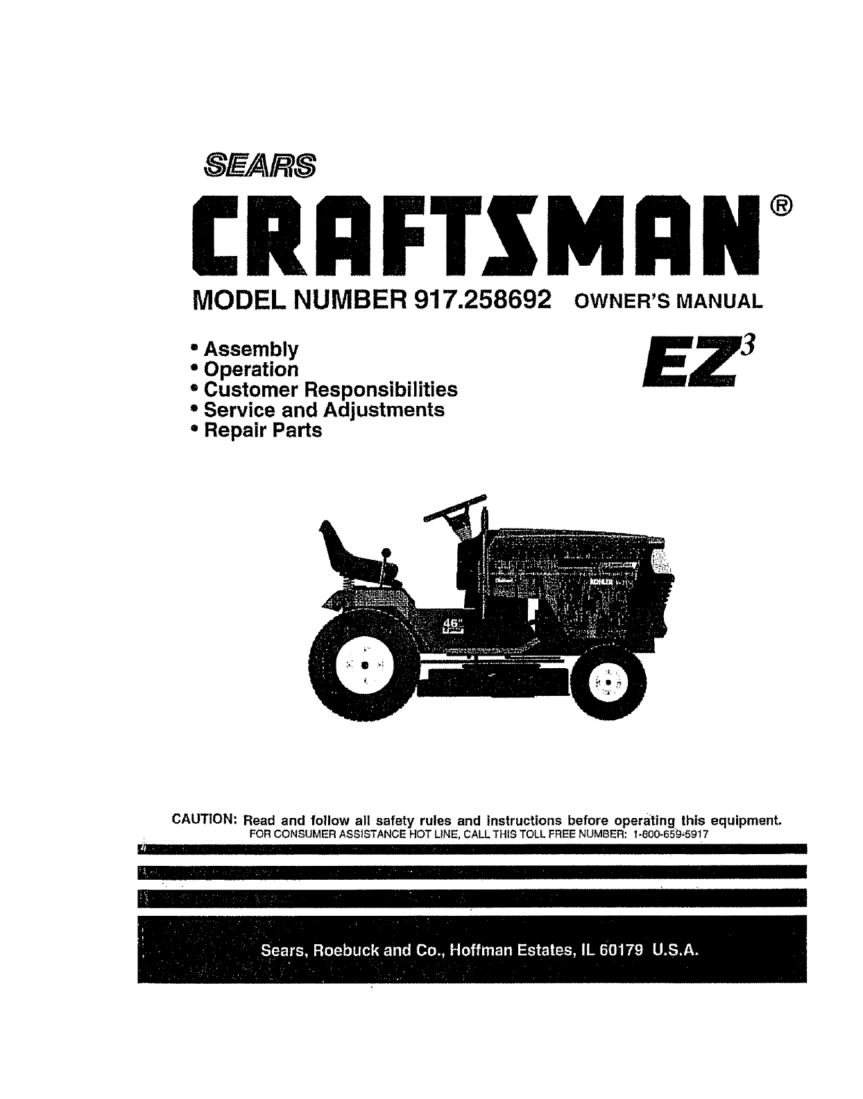 User Manual: Craftsman 917258692 917258692 CRAFTSMAN TRACTORS - Manuals and Guides View the owners manual for your CRAFTSMAN TRACTORS #917258692. Home:Lawn & Garden Parts:Craftsman Parts:Craftsman TRACTORS Manual