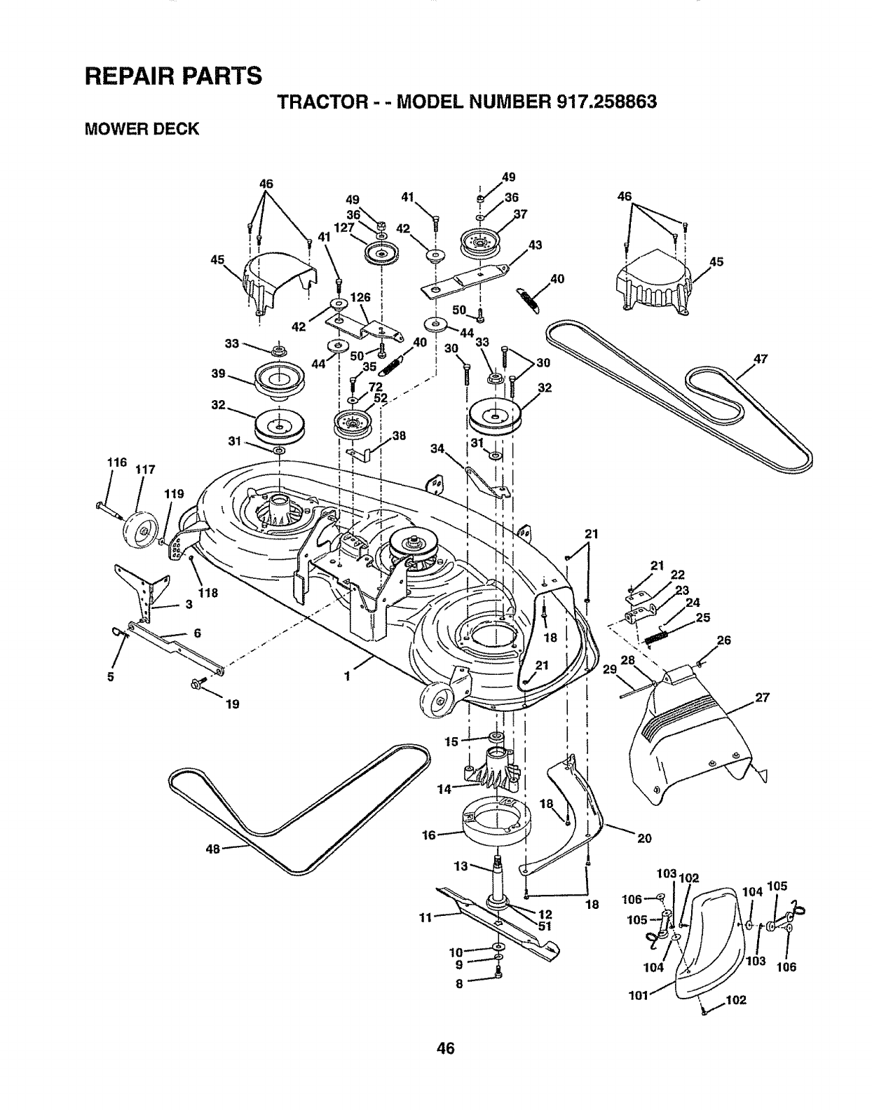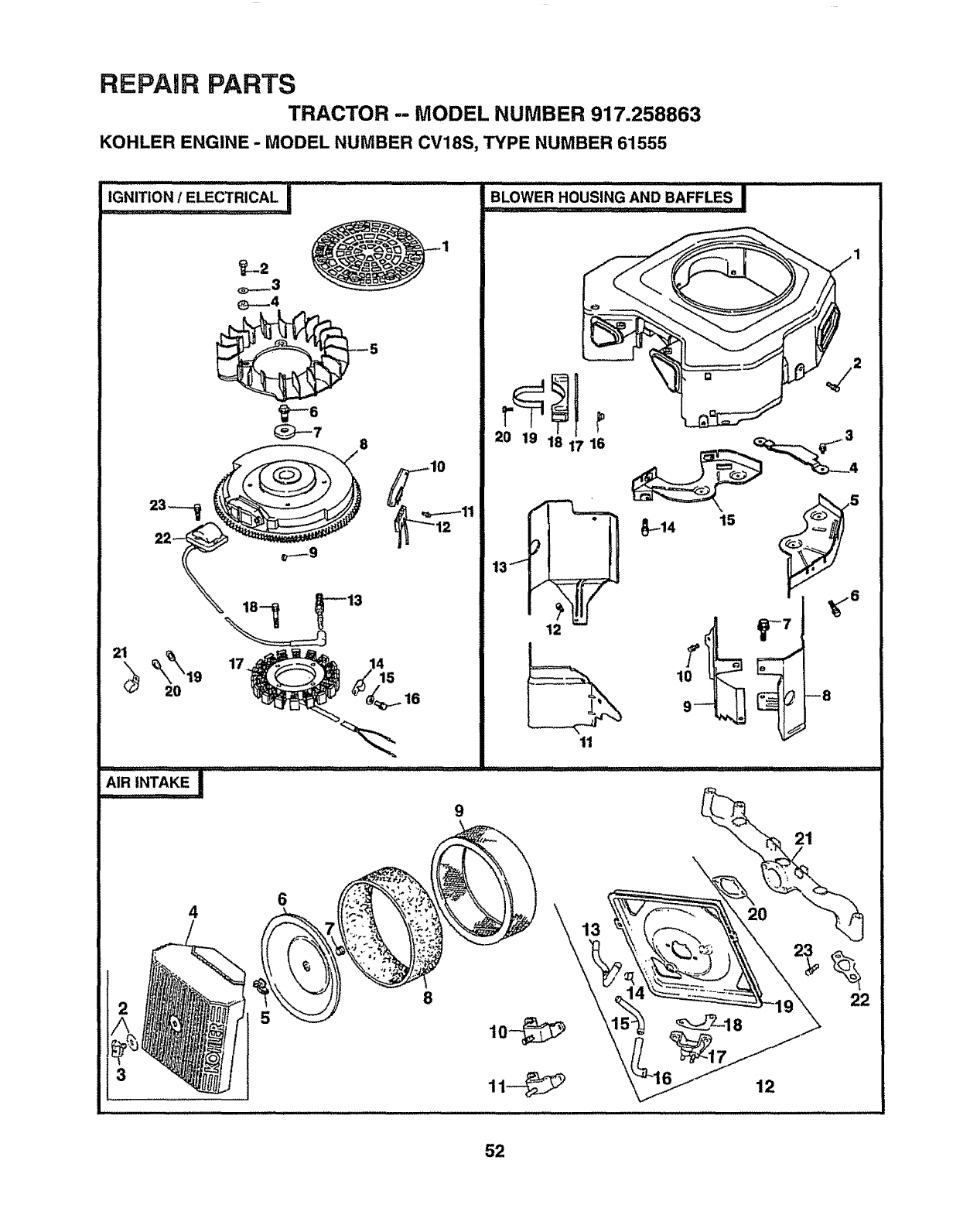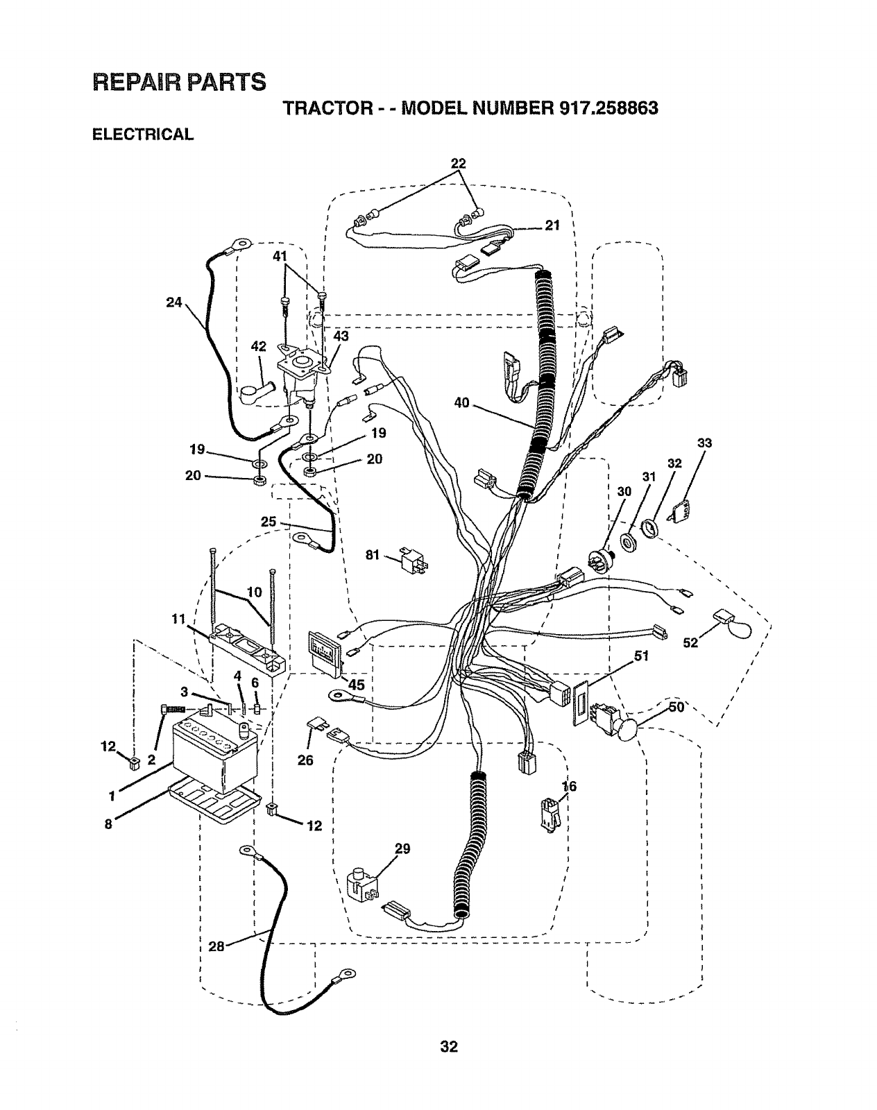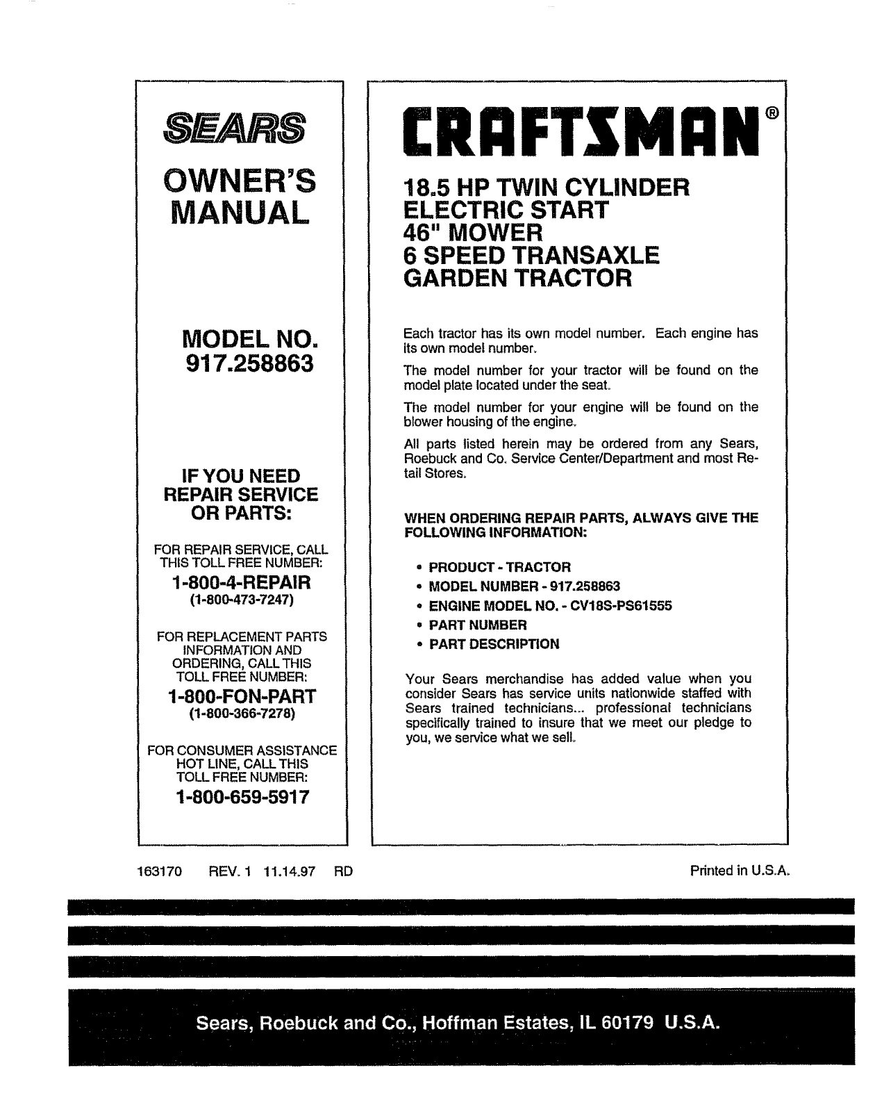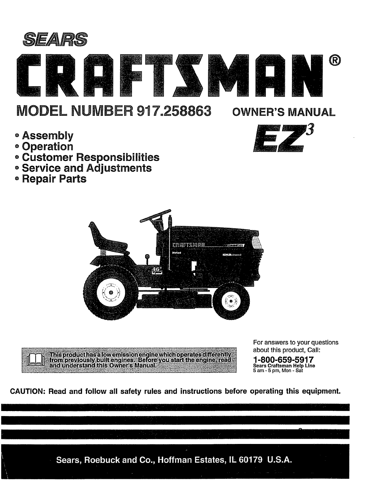 User Manual: Craftsman 917258863 917258863 CRAFTSMAN TRACTOR - Manuals and Guides View the owners manual for your CRAFTSMAN TRACTOR #917258863. Home:Lawn & Garden Parts:Craftsman Parts:Craftsman TRACTOR Manual