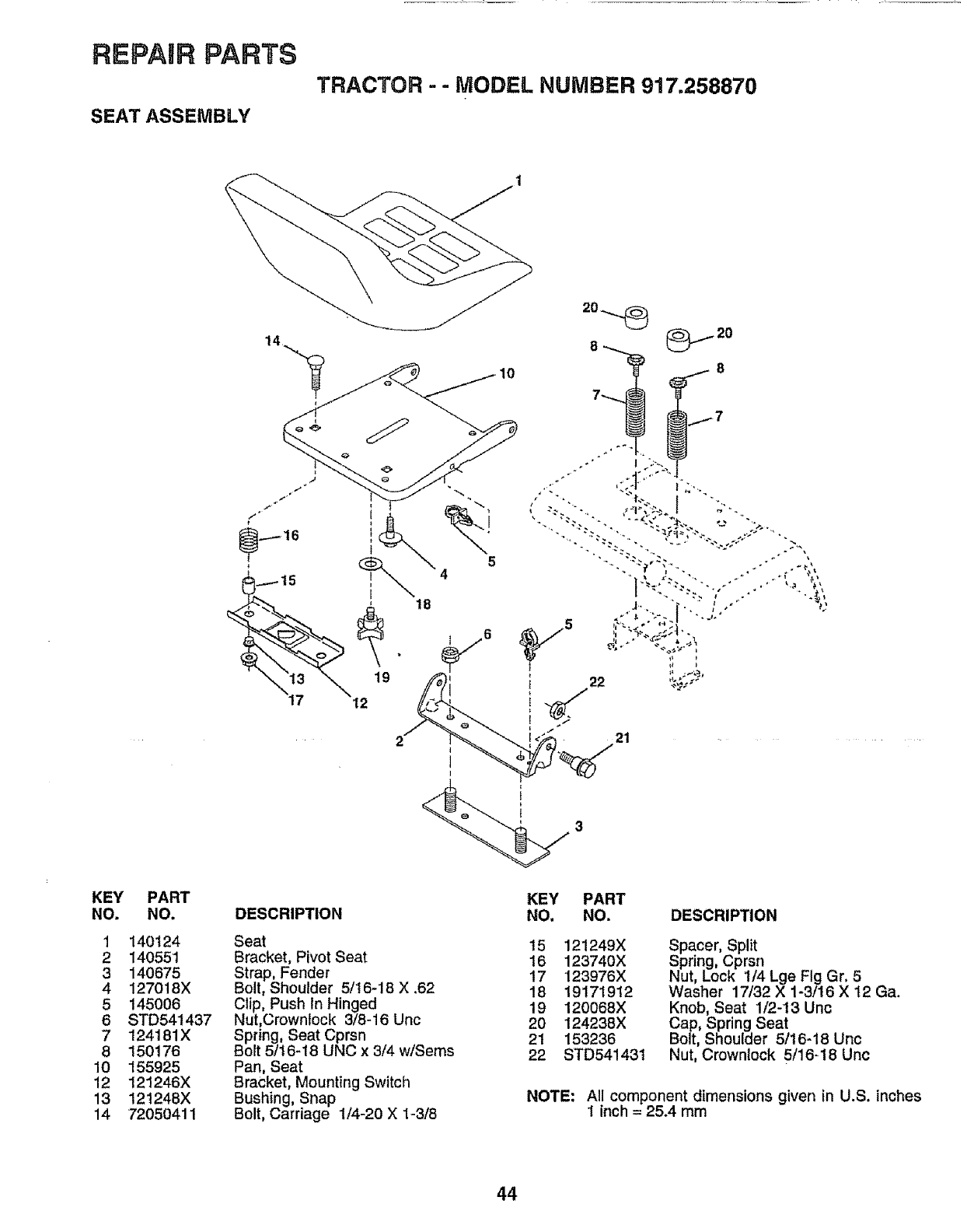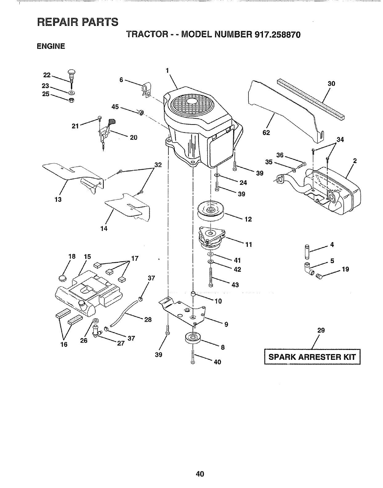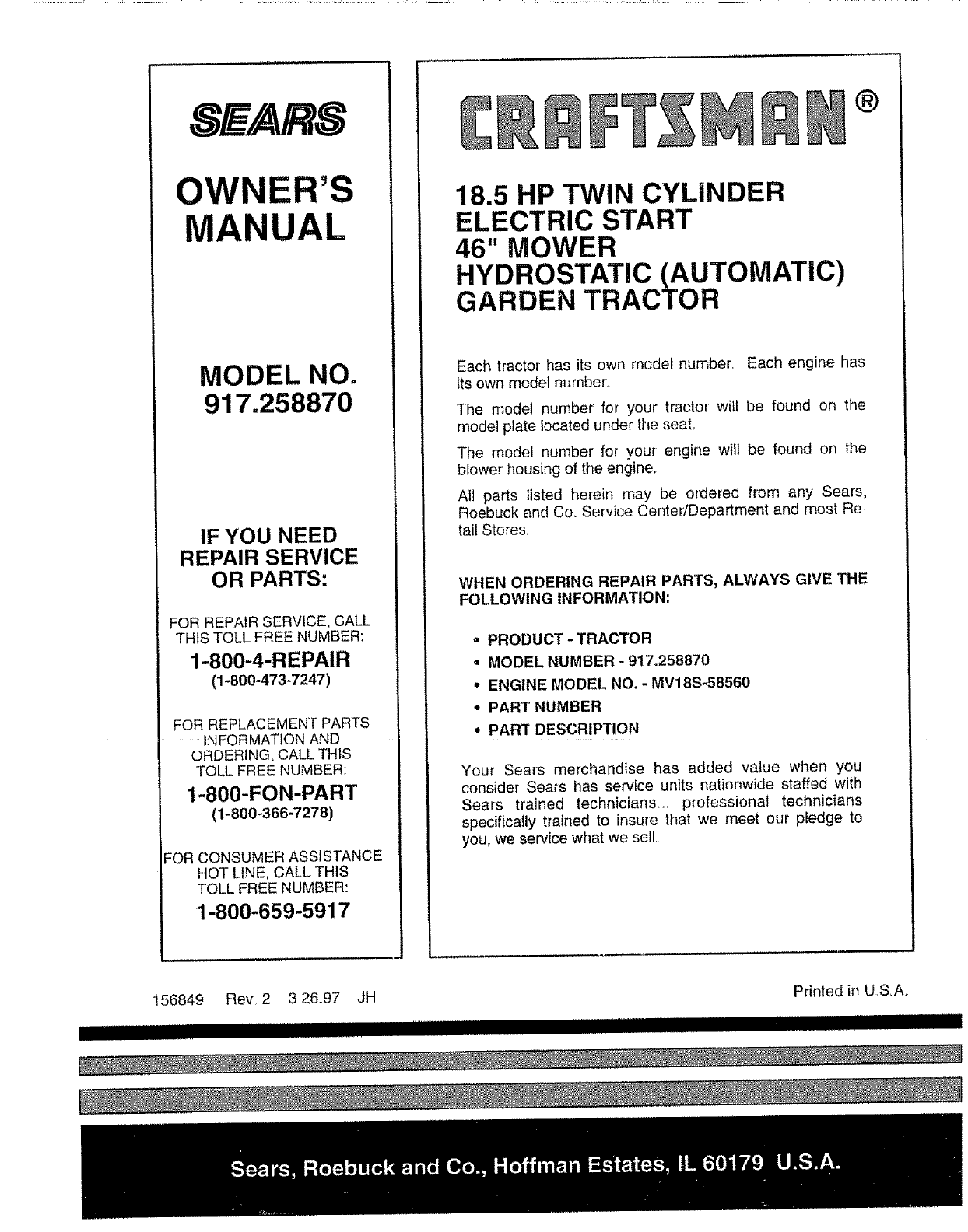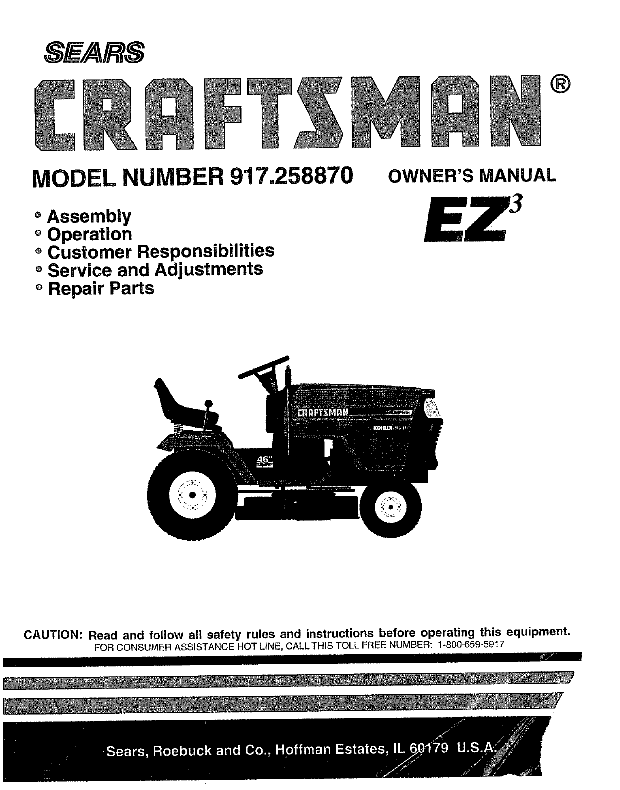 User Manual: Craftsman 917258870 917258870 CRAFTSMAN TRACTOR - Manuals and Guides View the owners manual for your CRAFTSMAN TRACTOR #917258870. Home:Lawn & Garden Parts:Craftsman Parts:Craftsman TRACTOR Manual