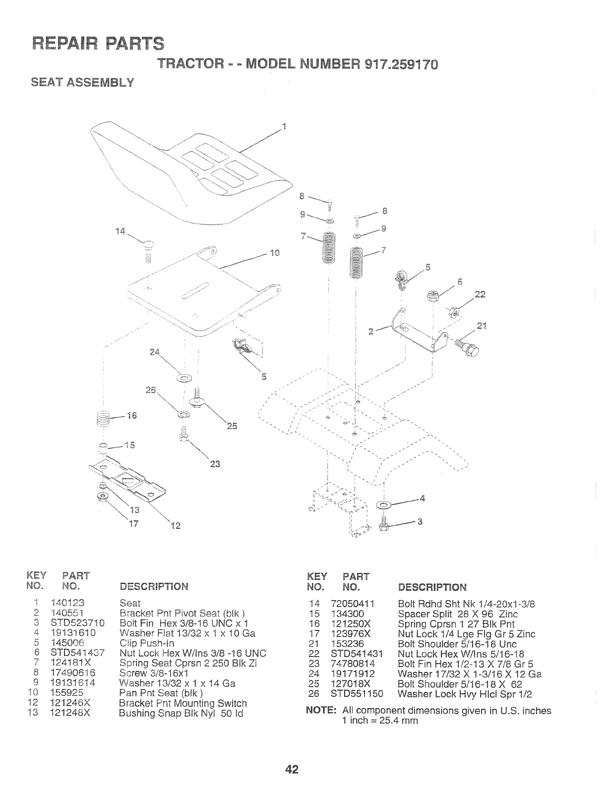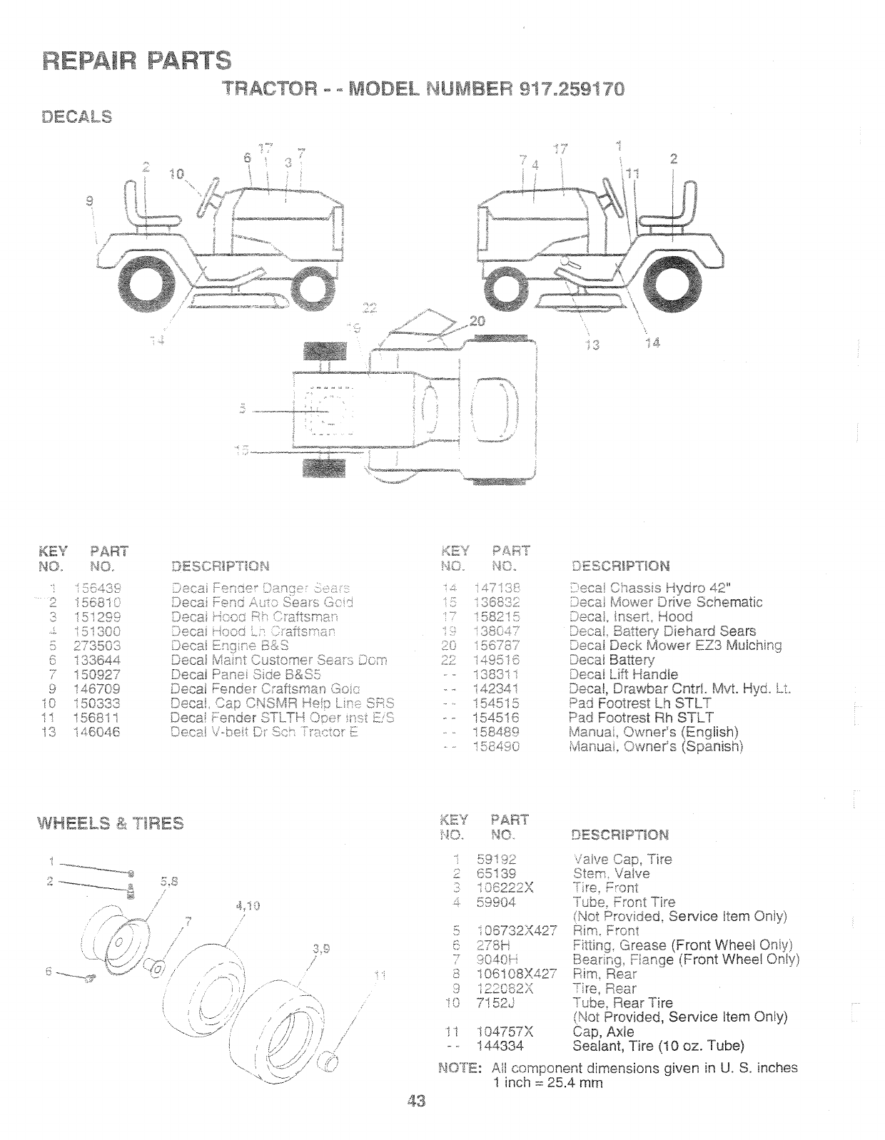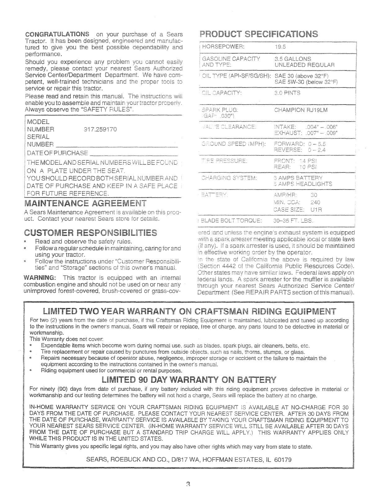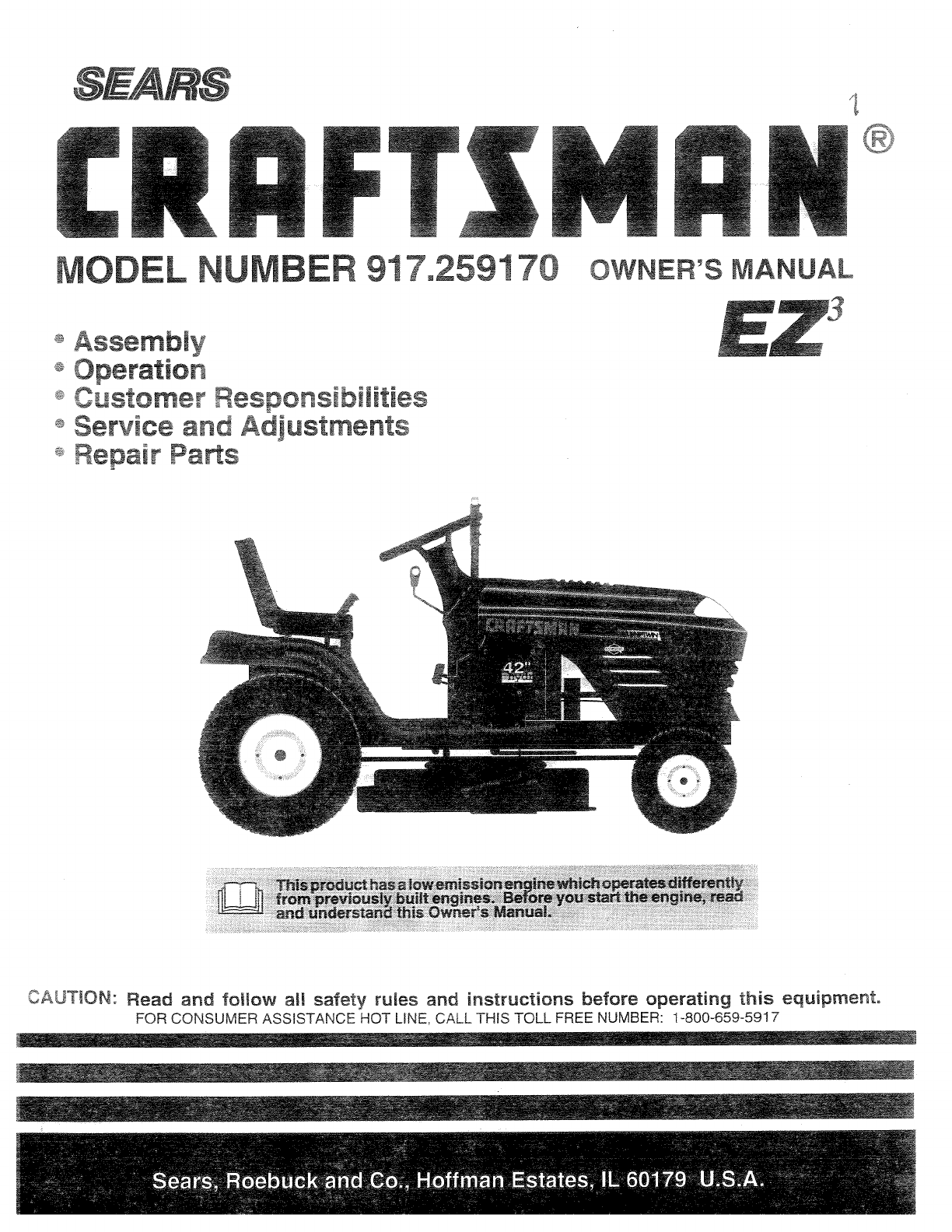 User Manual: Craftsman 917259170 917259170 CRAFTSMAN TRACTOR - Manuals and Guides View the owners manual for your CRAFTSMAN TRACTOR #917259170. Home:Lawn & Garden Parts:Craftsman Parts:Craftsman TRACTOR Manual