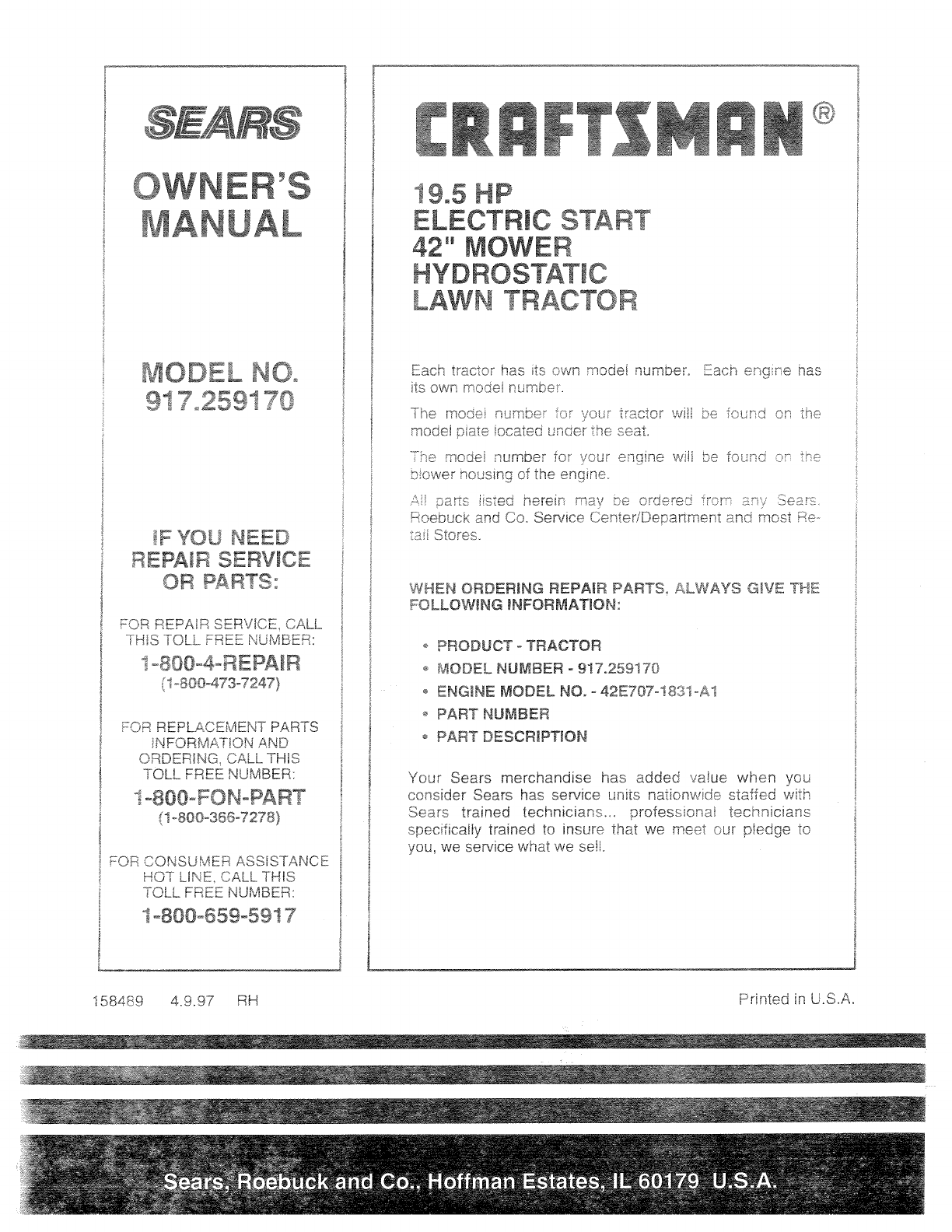Craftsman 917259170 User Manual TRACTOR Manuals And Guides 1108040L
