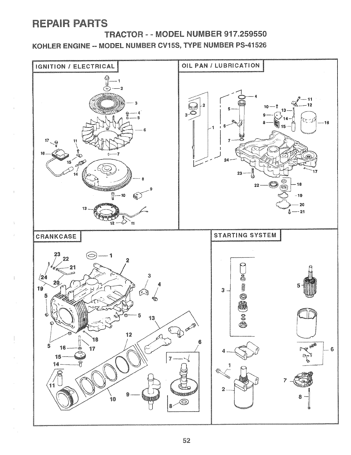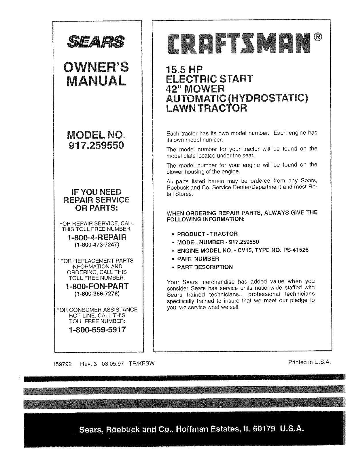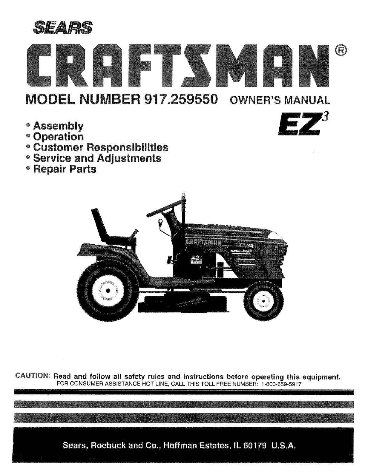User Manual: Craftsman 917259550 917259550 CRAFTSMAN TRACTOR - Manuals and Guides View the owners manual for your CRAFTSMAN TRACTOR #917259550. Home:Lawn & Garden Parts:Craftsman Parts:Craftsman TRACTOR Manual