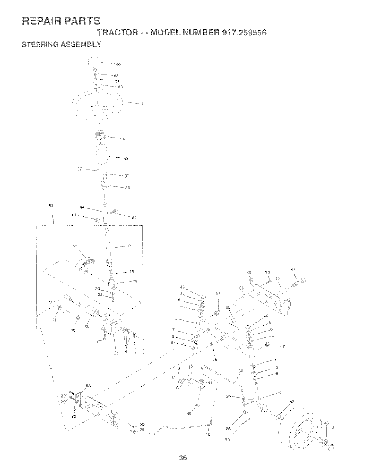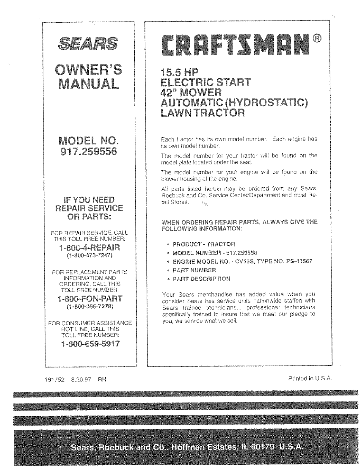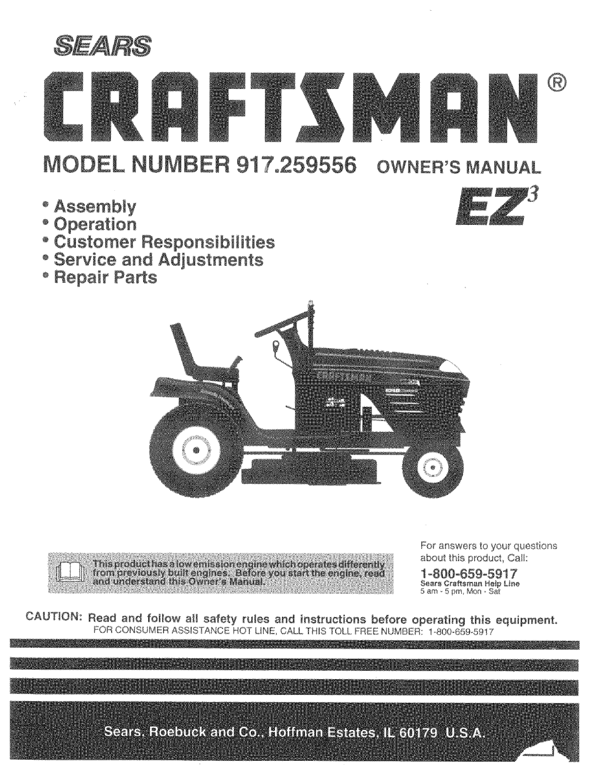 User Manual: Craftsman 917259556 917259556 CRAFTSMAN TRACTOR - Manuals and Guides View the owners manual for your CRAFTSMAN TRACTOR #917259556. Home:Lawn & Garden Parts:Craftsman Parts:Craftsman TRACTOR Manual