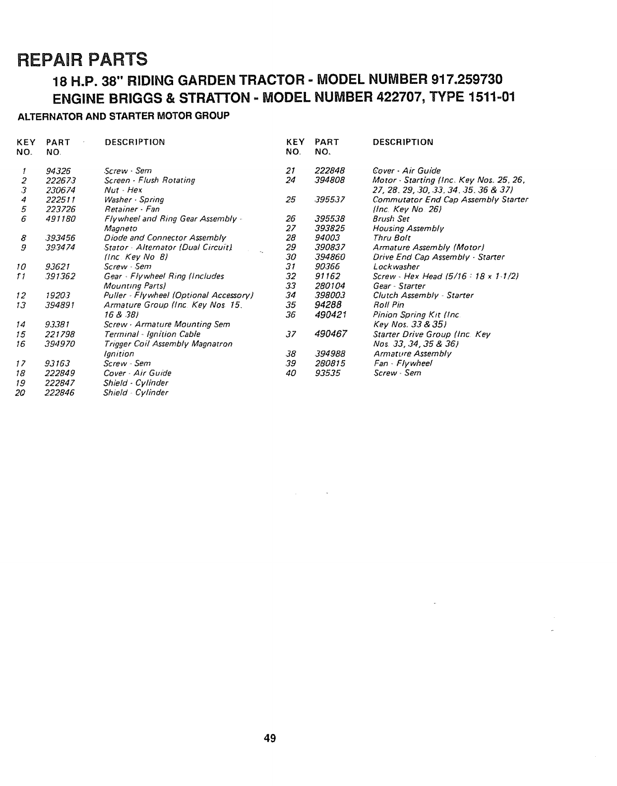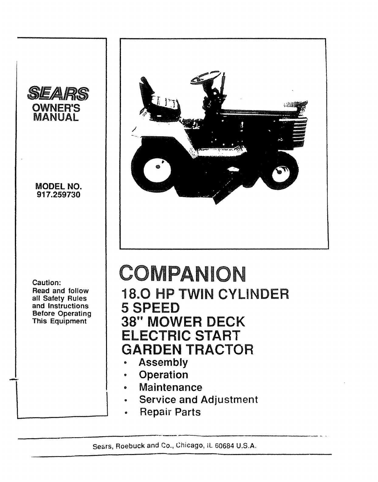 User Manual: Craftsman 917259730 917259730 CRAFTSMAN Lawn, Tractor - Manuals and Guides View the owners manual for your CRAFTSMAN Lawn, Tractor #917259730. Home:Lawn & Garden Parts:Craftsman Parts:Craftsman Lawn, Tractor Manual