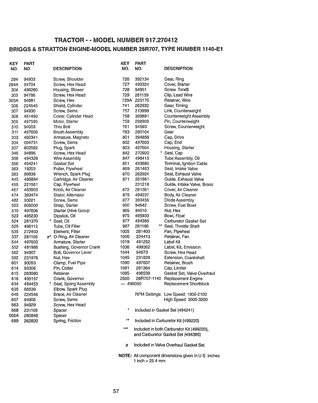 646 224546 Brace, Air Cleaner RPM Settings: Low Speed: 1900-2100