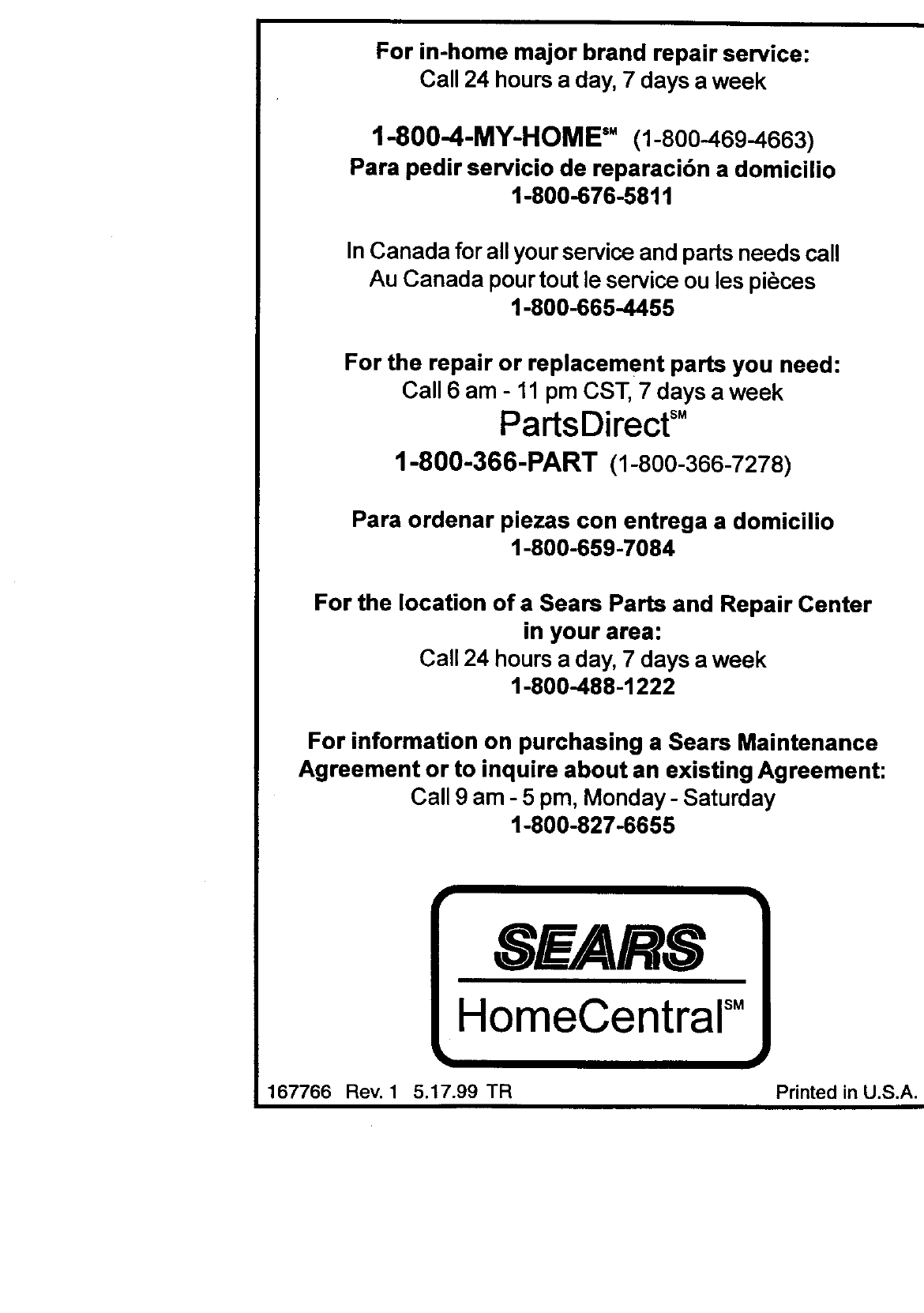 manual, Sears will repair or replace, free of charge, any parts found to be defective in