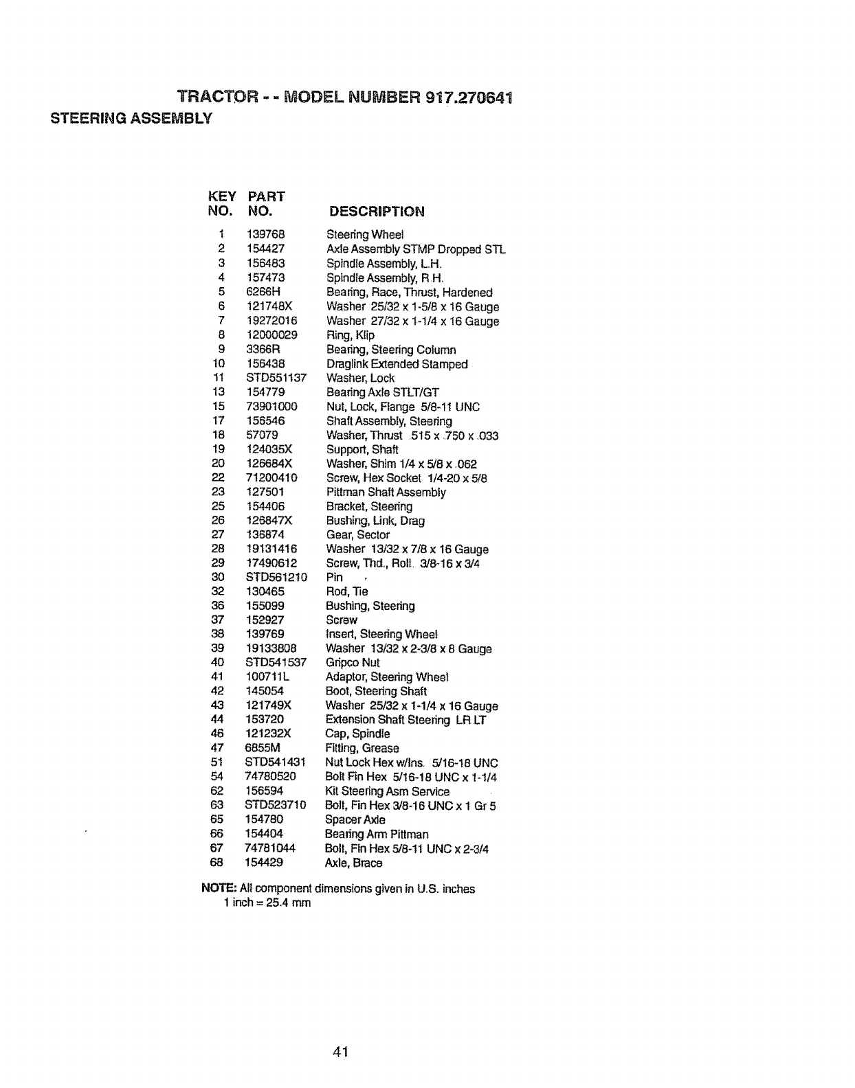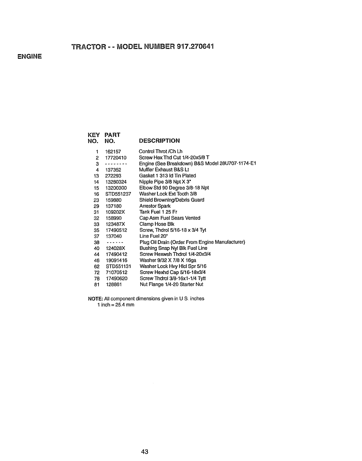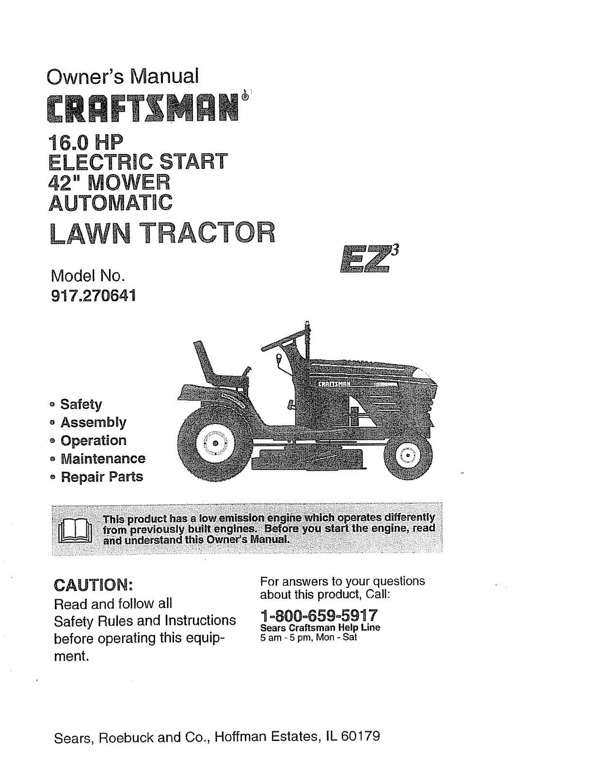 User Manual: Craftsman 917270641 917270641 CRAFTSMAN TRACTOR - Manuals and Guides View the owners manual for your CRAFTSMAN TRACTOR #917270641. Home:Lawn & Garden Parts:Craftsman Parts:Craftsman TRACTOR Manual