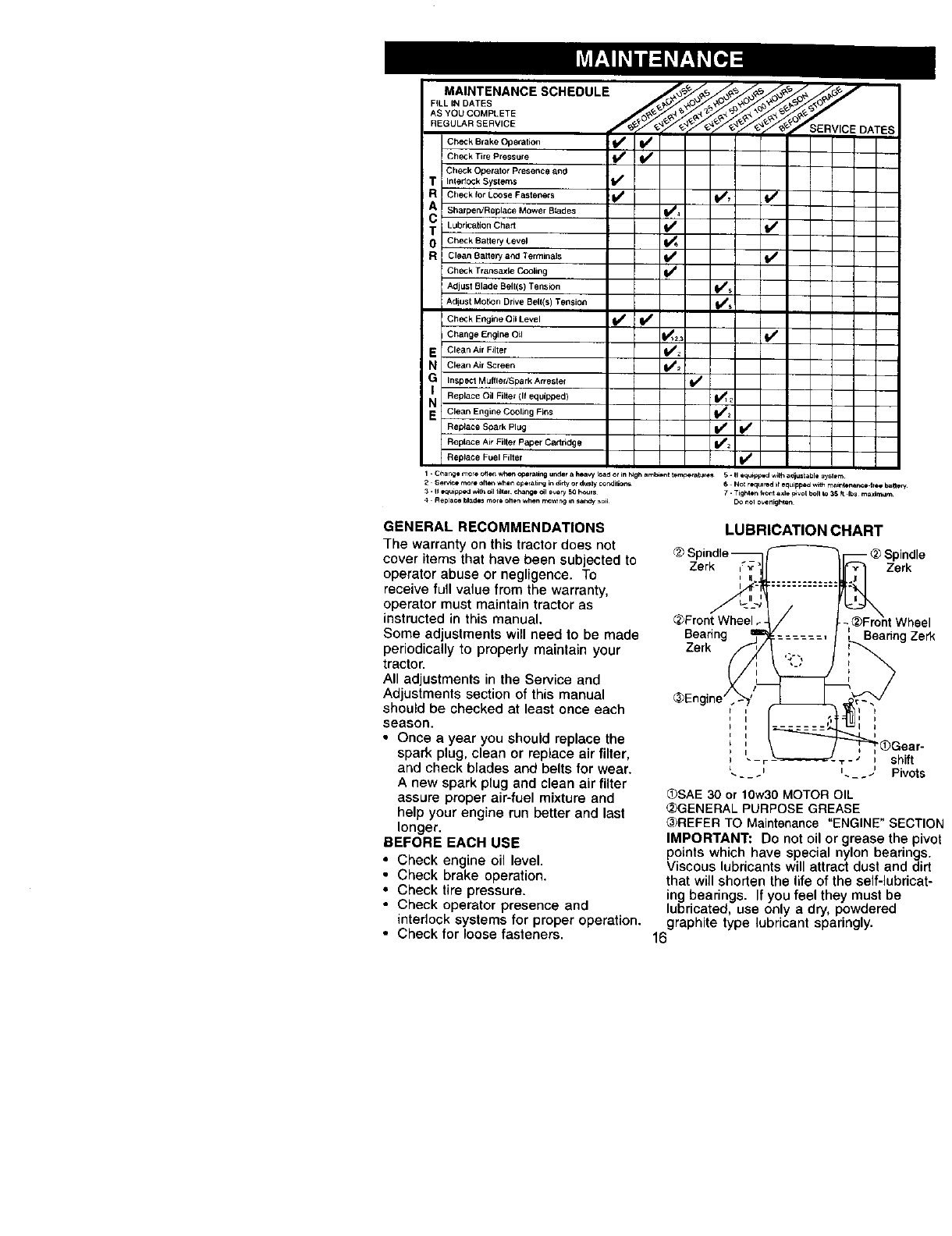 proper grade and amount of engine oil, failure to keep the deck clear of flammable
