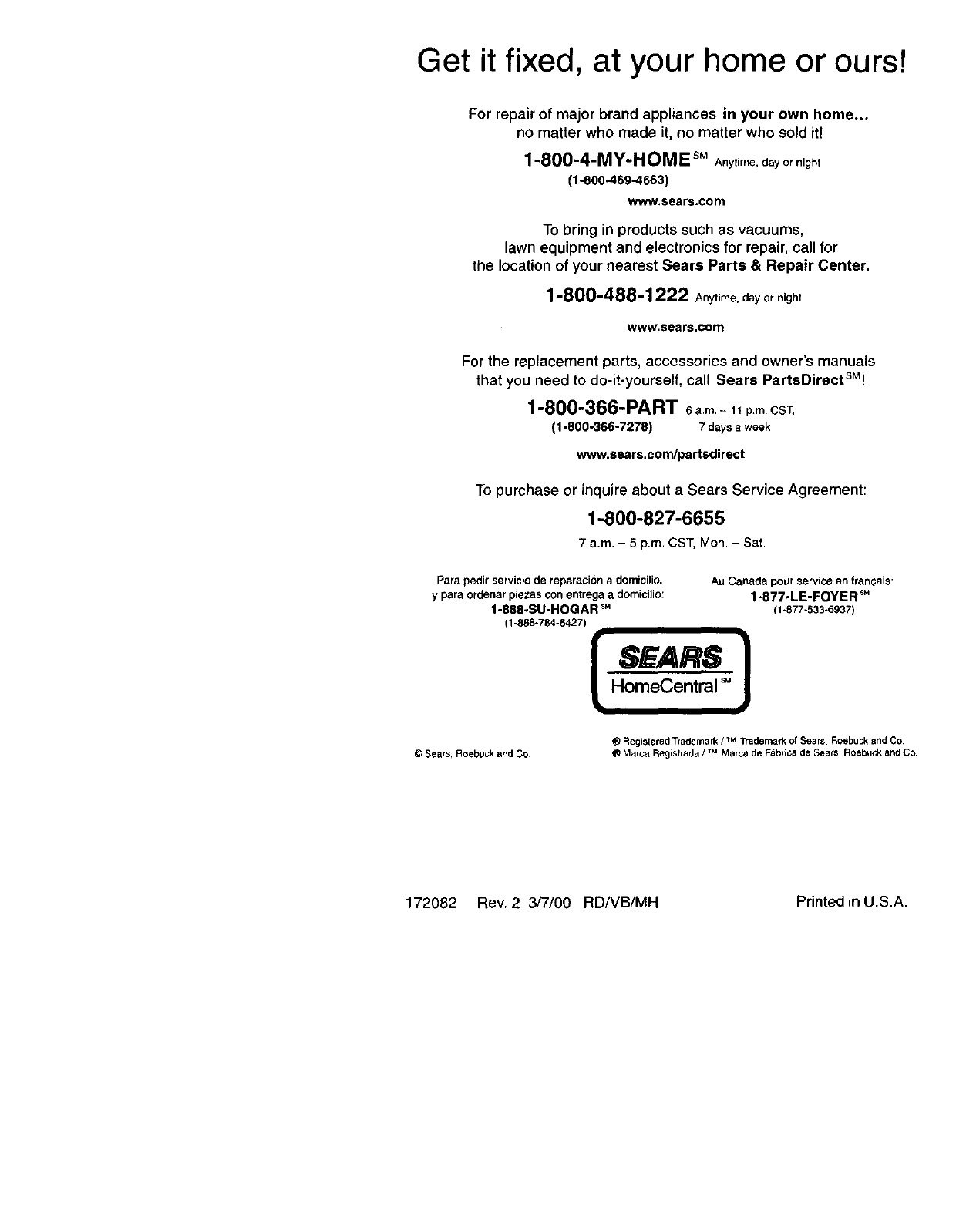 172082 Rev. 2 3/7/00 RD/VB/MH Printed in U.S.A.
