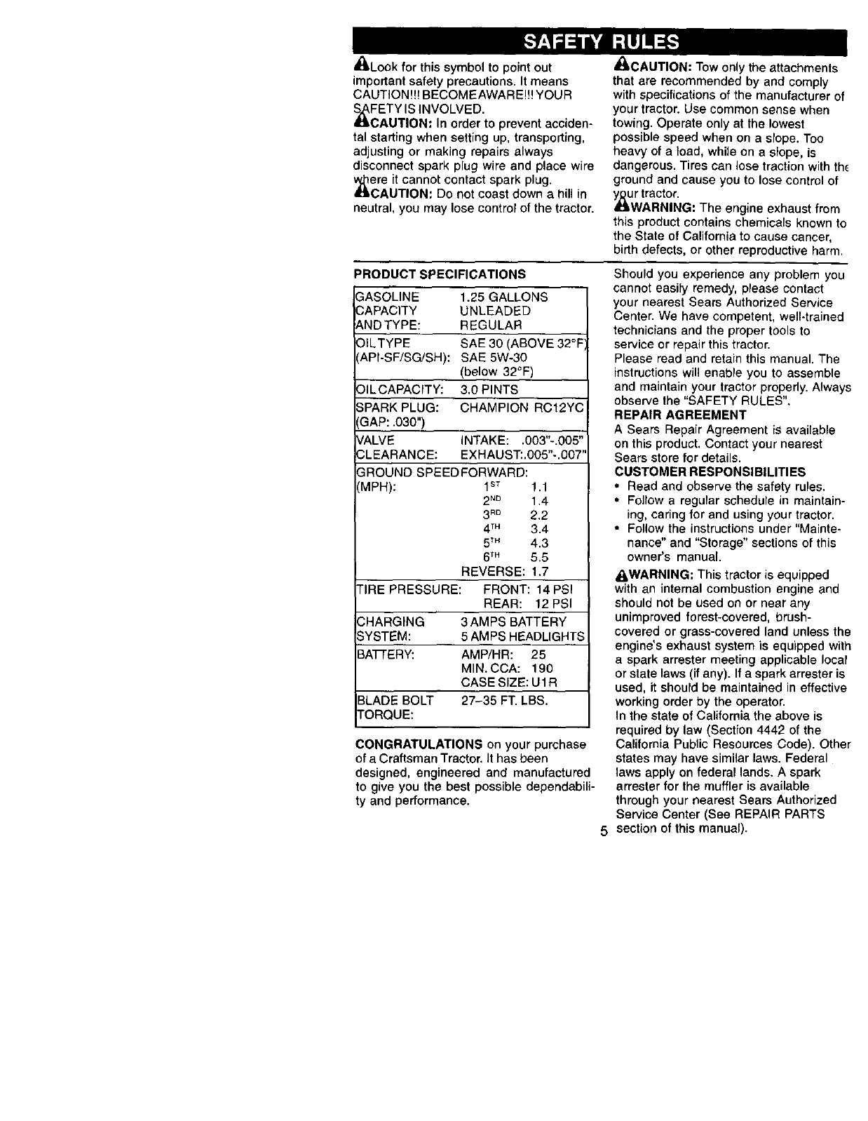 ranty service is available free of charge by taking your Craftsman riding equipment to