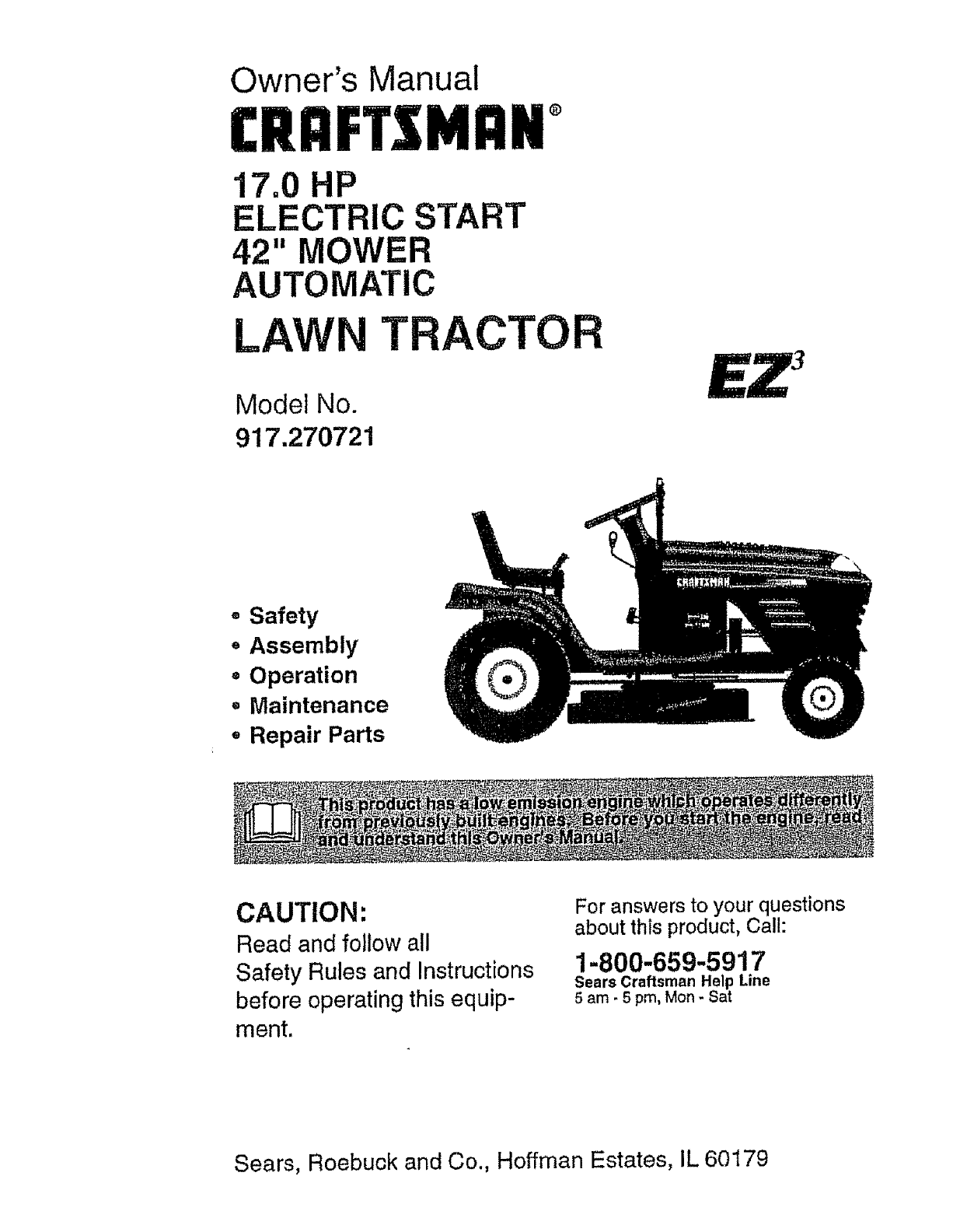 User Manual: Craftsman 917270721 917270721 CRAFTSMAN TRACTOR - Manuals and Guides View the owners manual for your CRAFTSMAN TRACTOR #917270721. Home:Lawn & Garden Parts:Craftsman Parts:Craftsman TRACTOR Manual