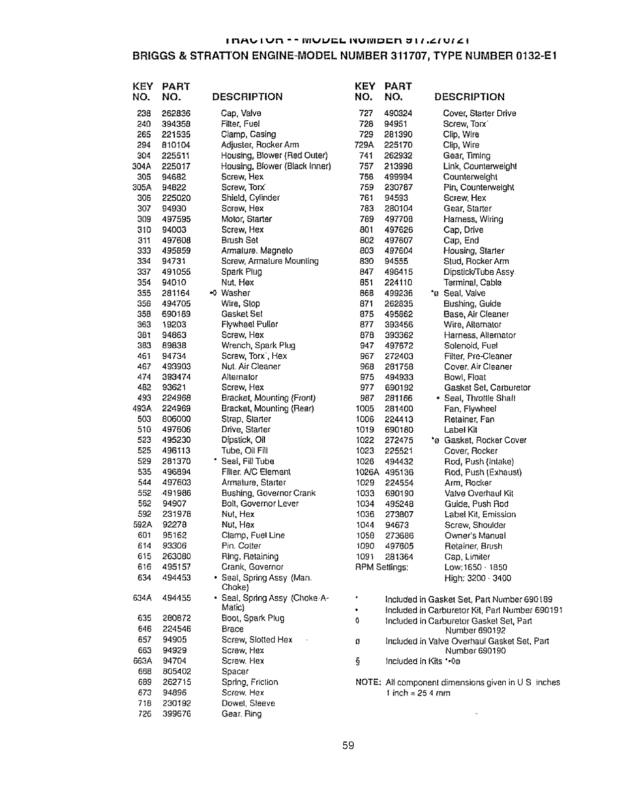 616 495157 Crank, Governor RPM Settings: Low;1650_ 1850