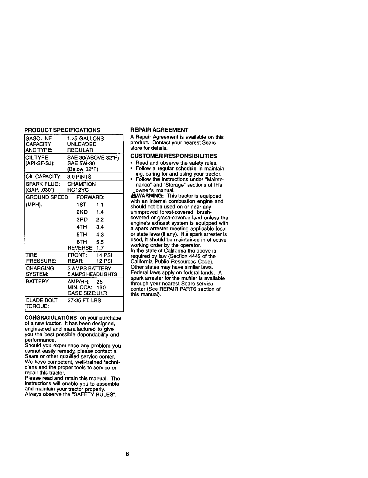 manual, Sears will repair or replace, free of charge, any parts found to be defective in