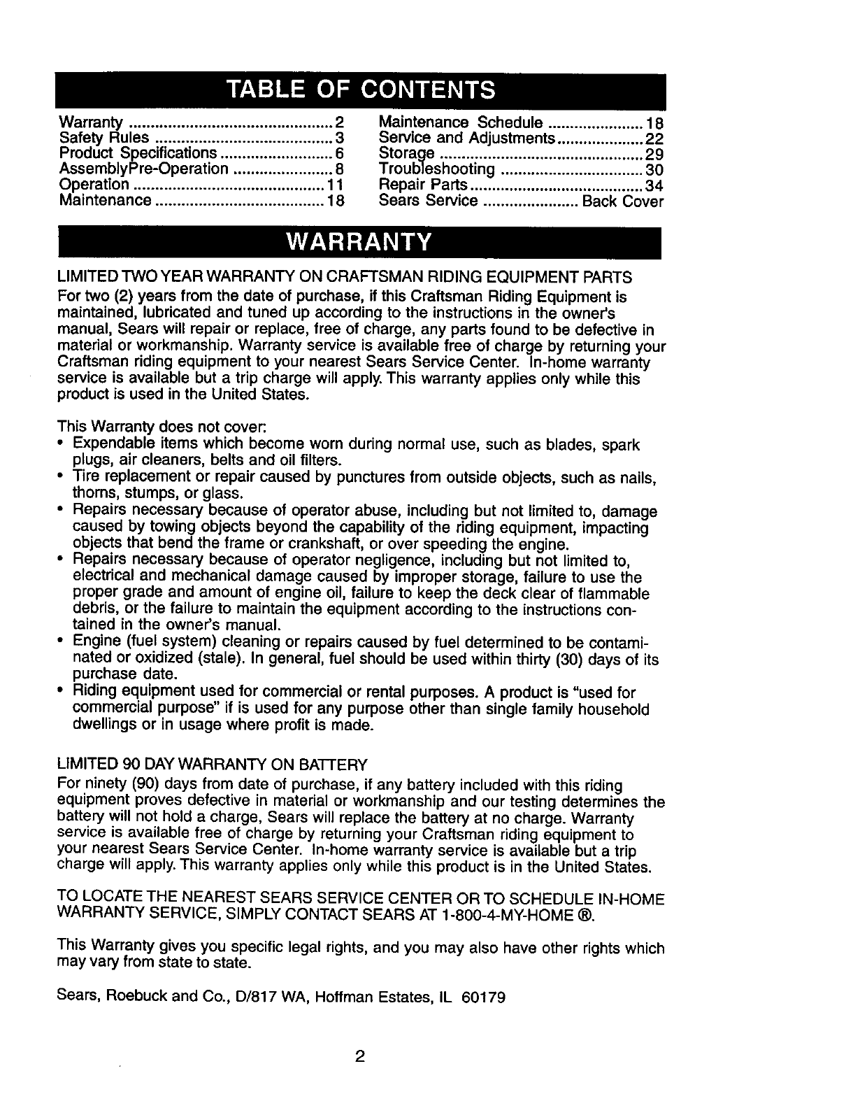 LIMITED TWO YEAR WARRANTY ON CRAFTSMAN RIDING EQUIPMENT PARTS