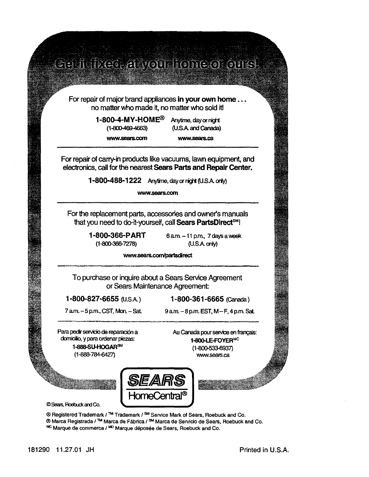 ® Maroe Registrada ITMMarca de F_bdca !sMMarca de Servicio de Sears, Roebuck and Co.