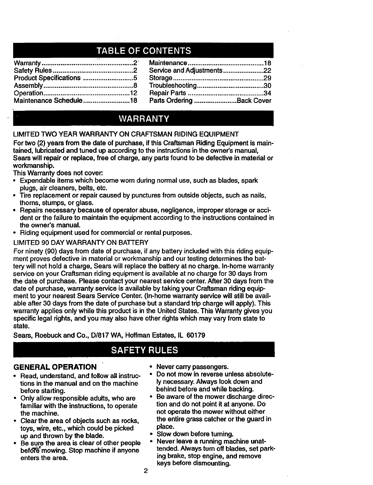 LIMITED TWO YEAR WARRANTY ON CRAFTSMAN RIDING EQUIPMENT