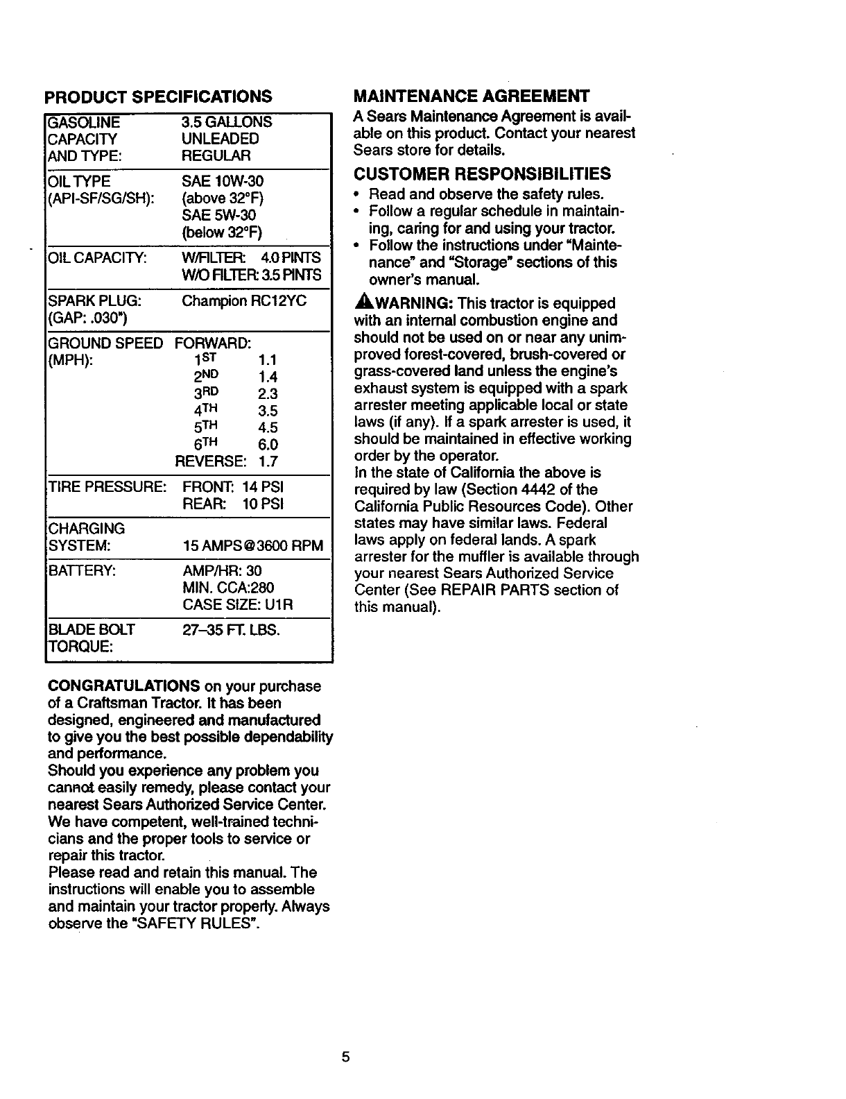 date of purchase, warranty service is available by taking your Craftsman riding equip-