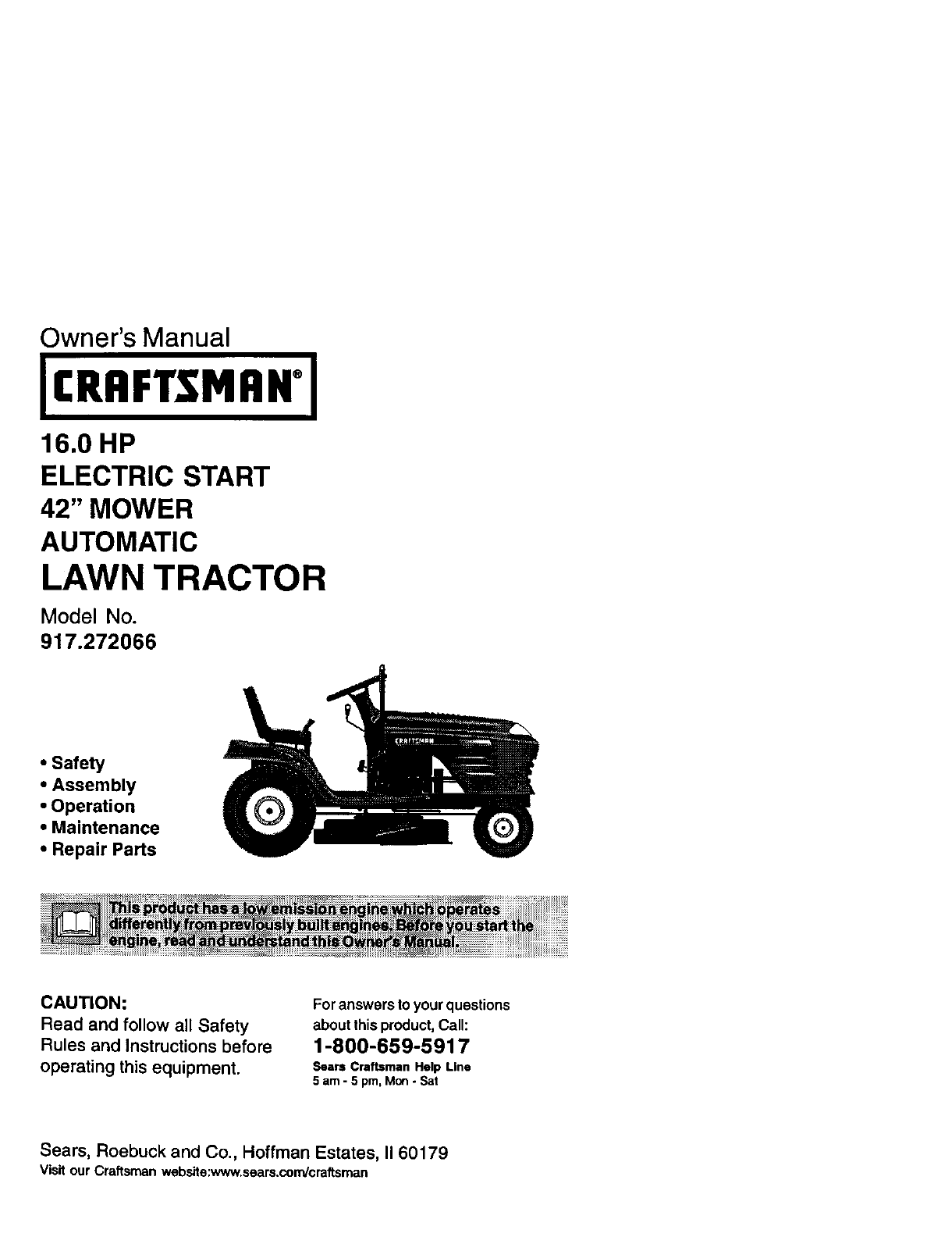 User Manual: Craftsman 917272066 917272066 CRAFTSMAN LAWN TRACTOR - Manuals and Guides View the owners manual for your CRAFTSMAN LAWN TRACTOR #917272066. Home:Lawn & Garden Parts:Craftsman Parts:Craftsman LAWN TRACTOR Manual