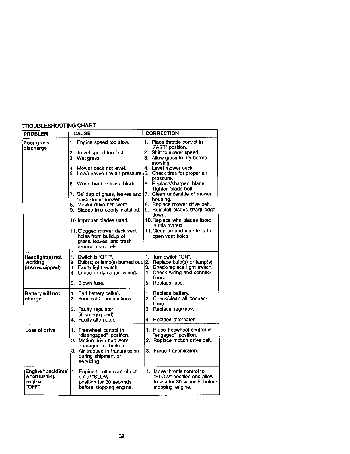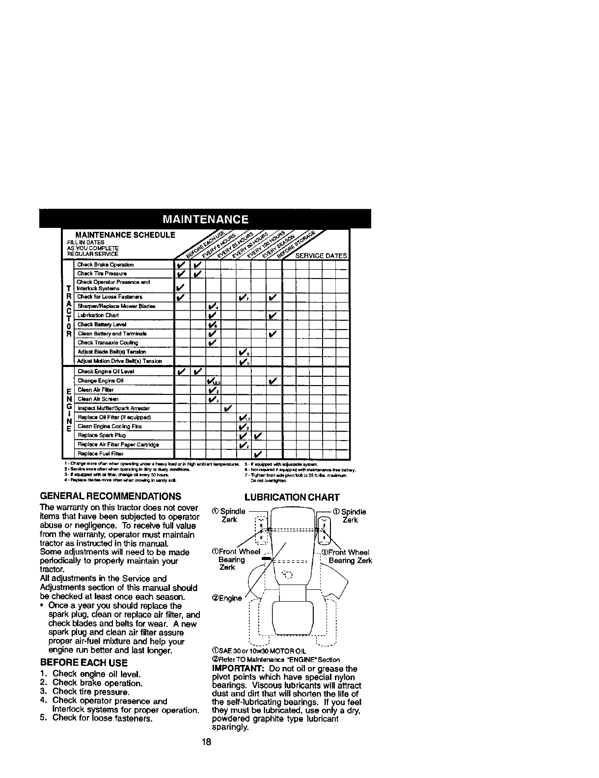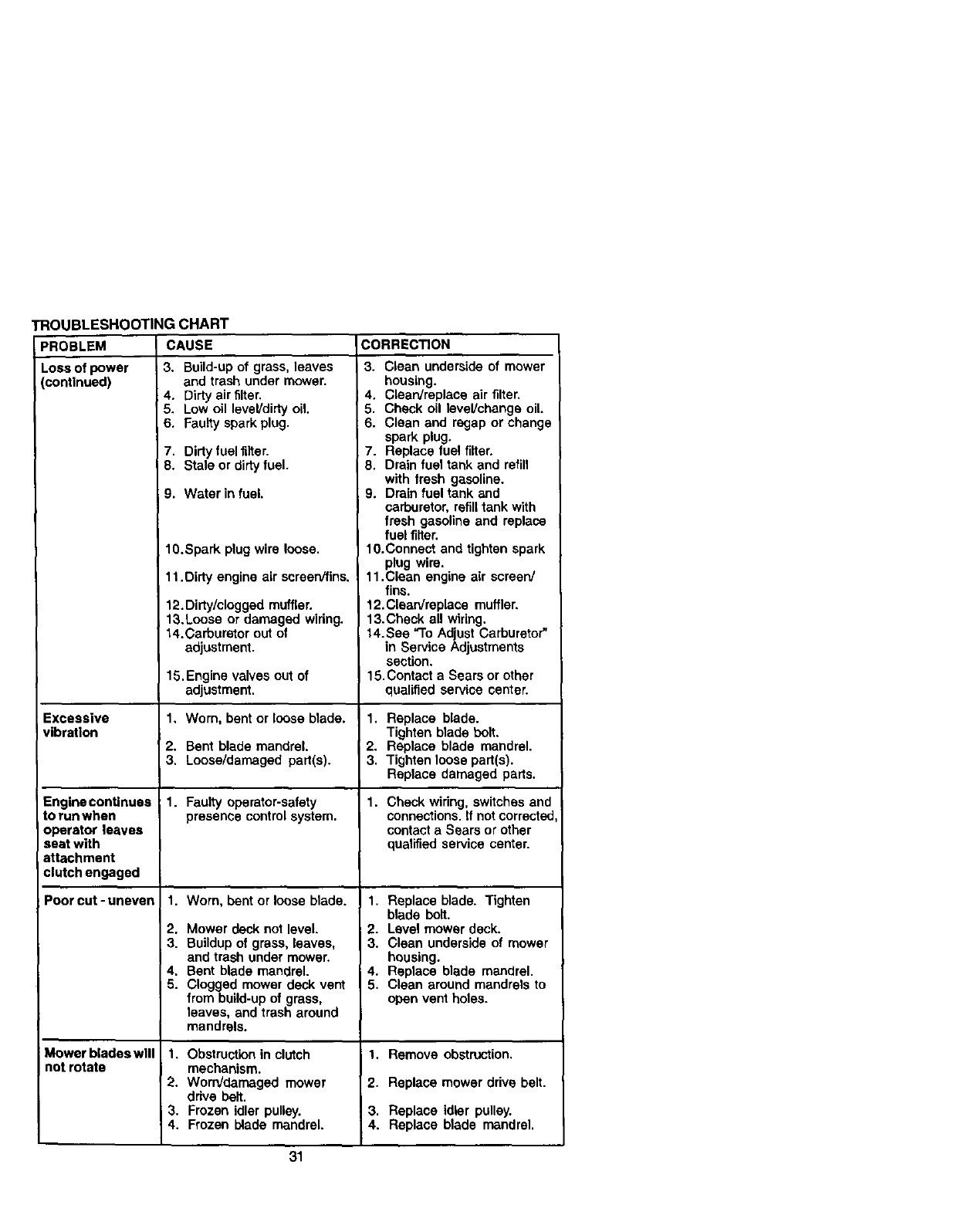 proper grade and amount of engine oil,failure to keep the deck clear of flammable