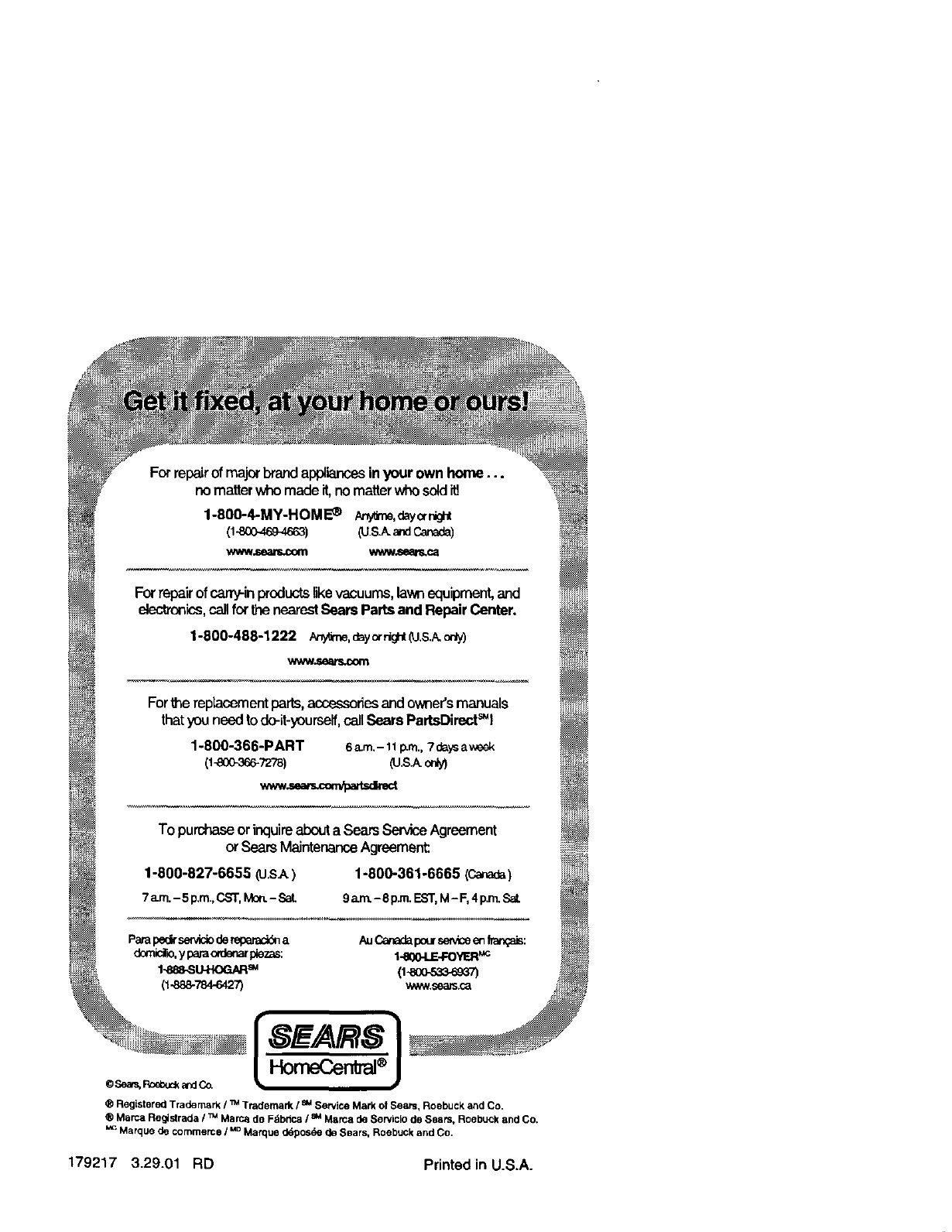 HOME WARRANTY SERVICE, SIMPLY CONTACT SEARS AT 1-800-4-MY-HOME