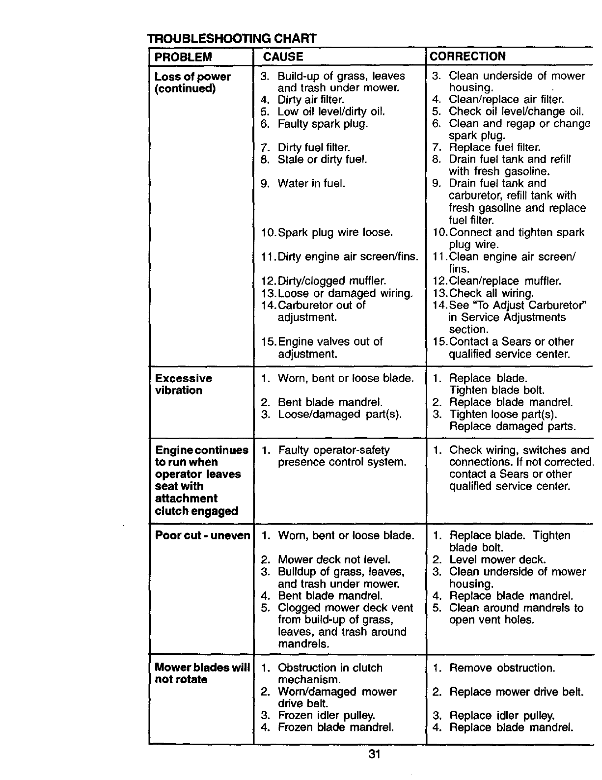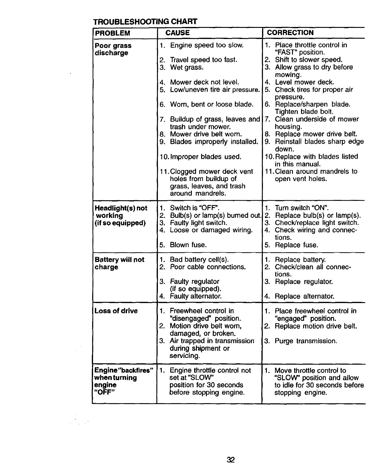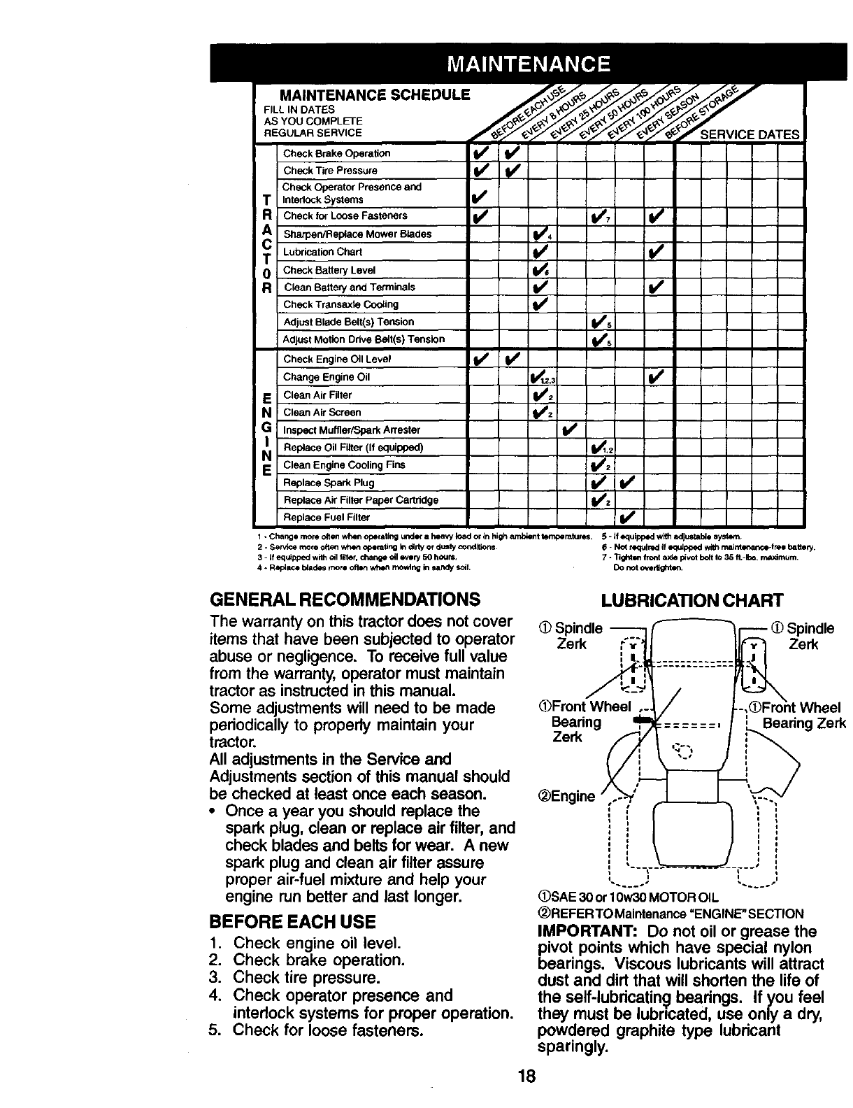 proper grade and amount of engine oil, failure to keep the deck clear of flammable