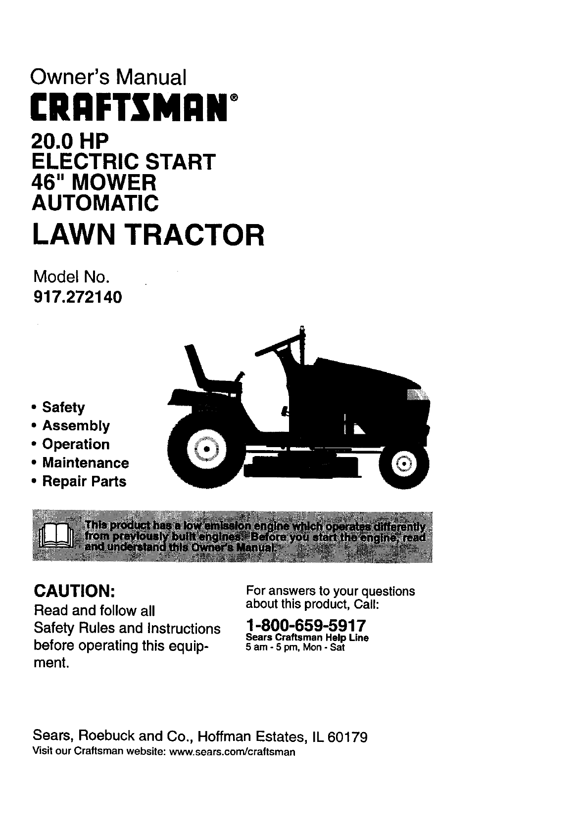 User Manual: Craftsman 917272140 917272140 CRAFTSMAN LAWN TRACTOR - Manuals and Guides View the owners manual for your CRAFTSMAN LAWN TRACTOR #917272140. Home:Lawn & Garden Parts:Craftsman Parts:Craftsman LAWN TRACTOR Manual