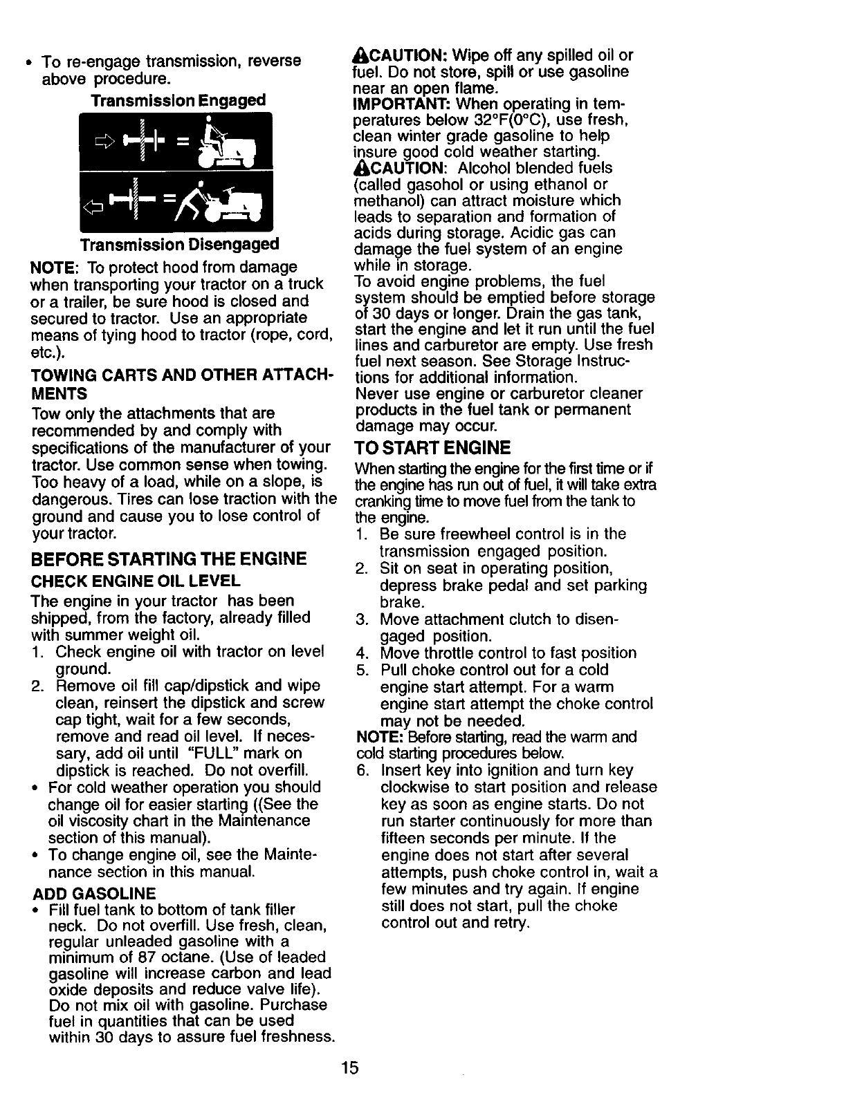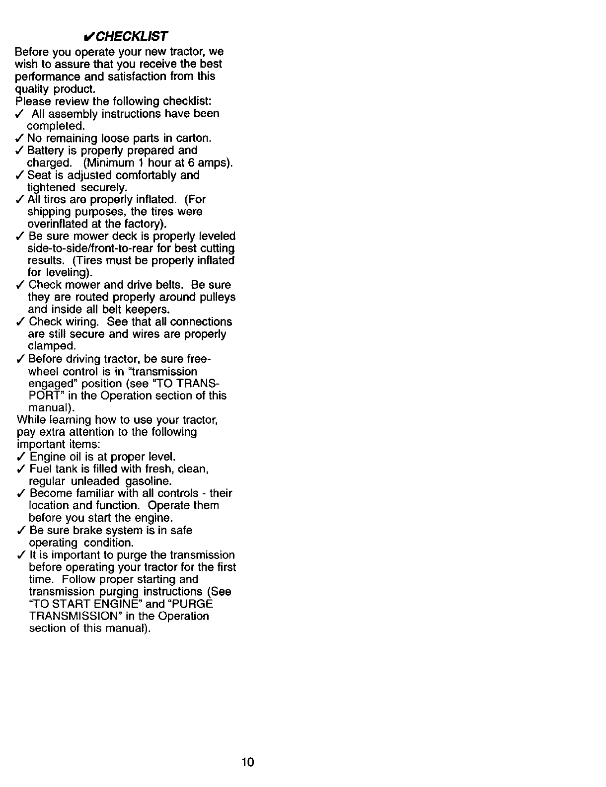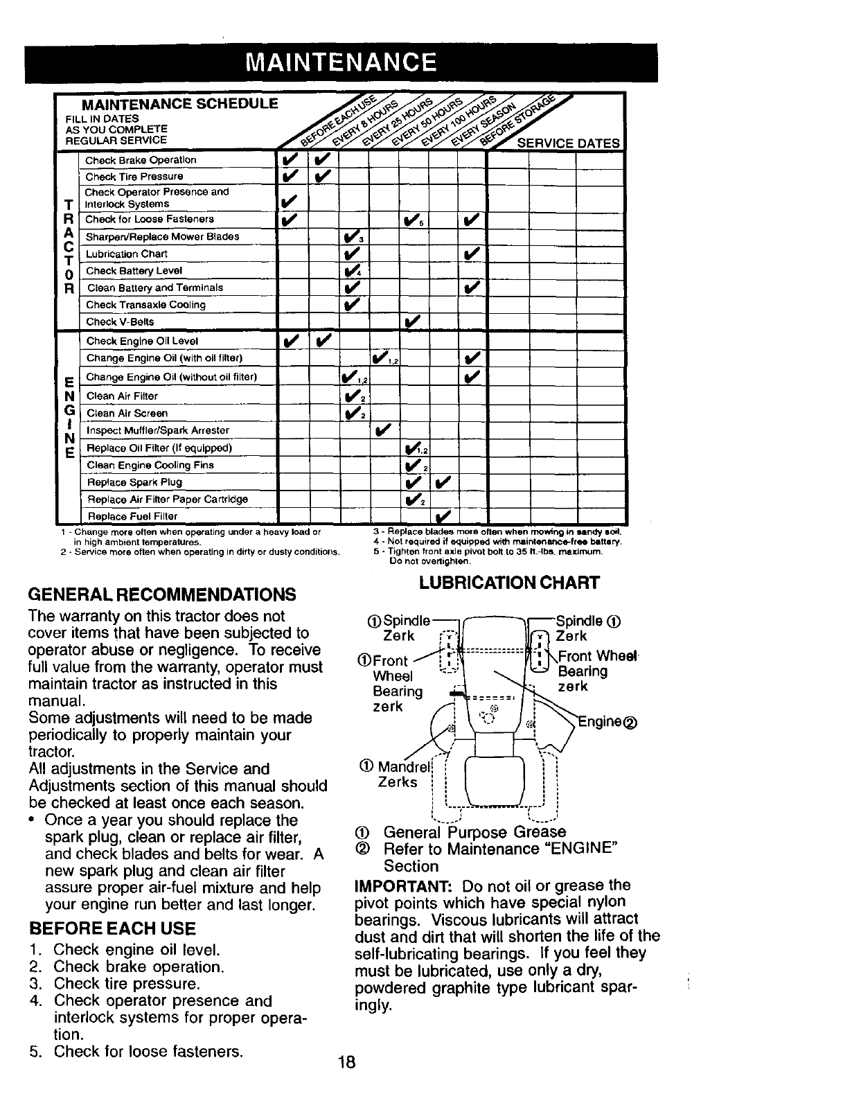proper grade and amount of engine oil, failure to keep the deck clear of flammable