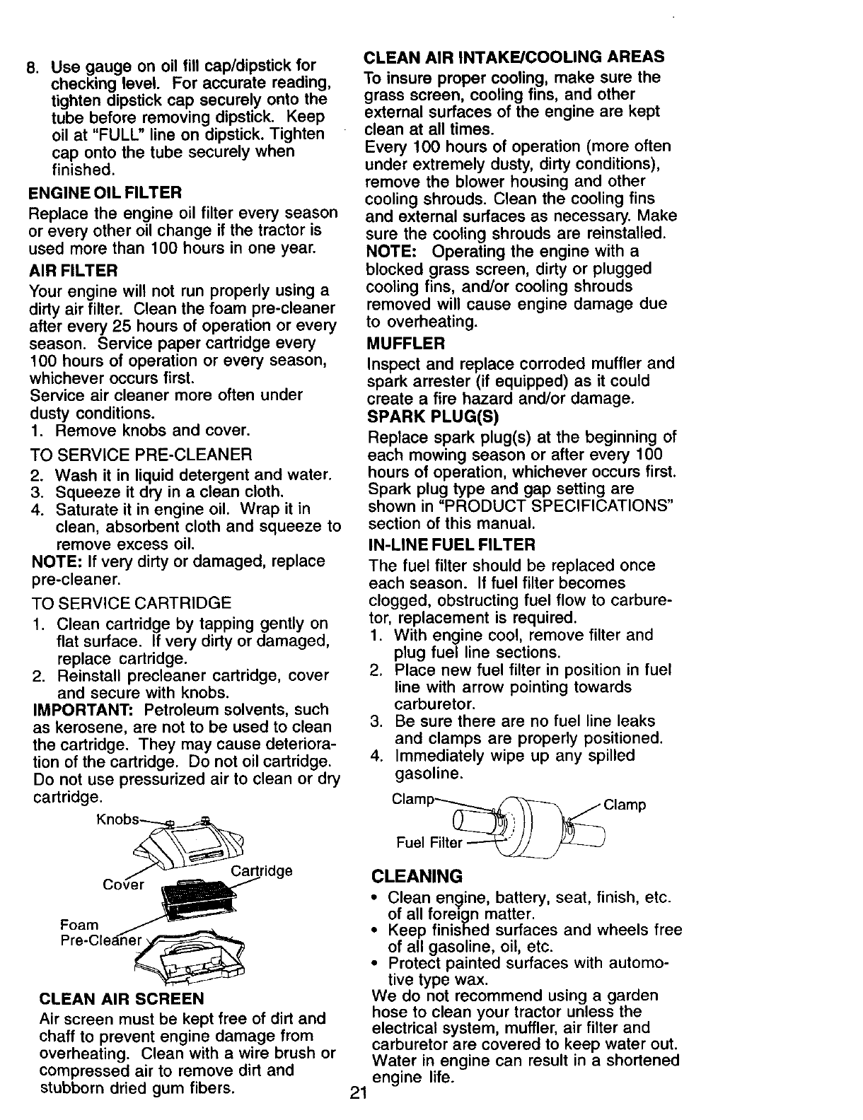 to blades, spark plugs, air cleaners, belts, and oil filters.
