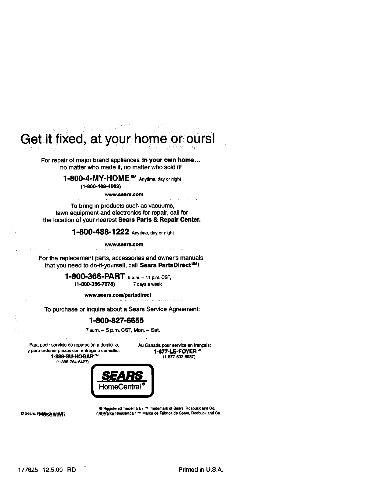 WARRANTY SERVICE, SIMPLY CONTACT SEARS AT 1-800-4-MY-HOME