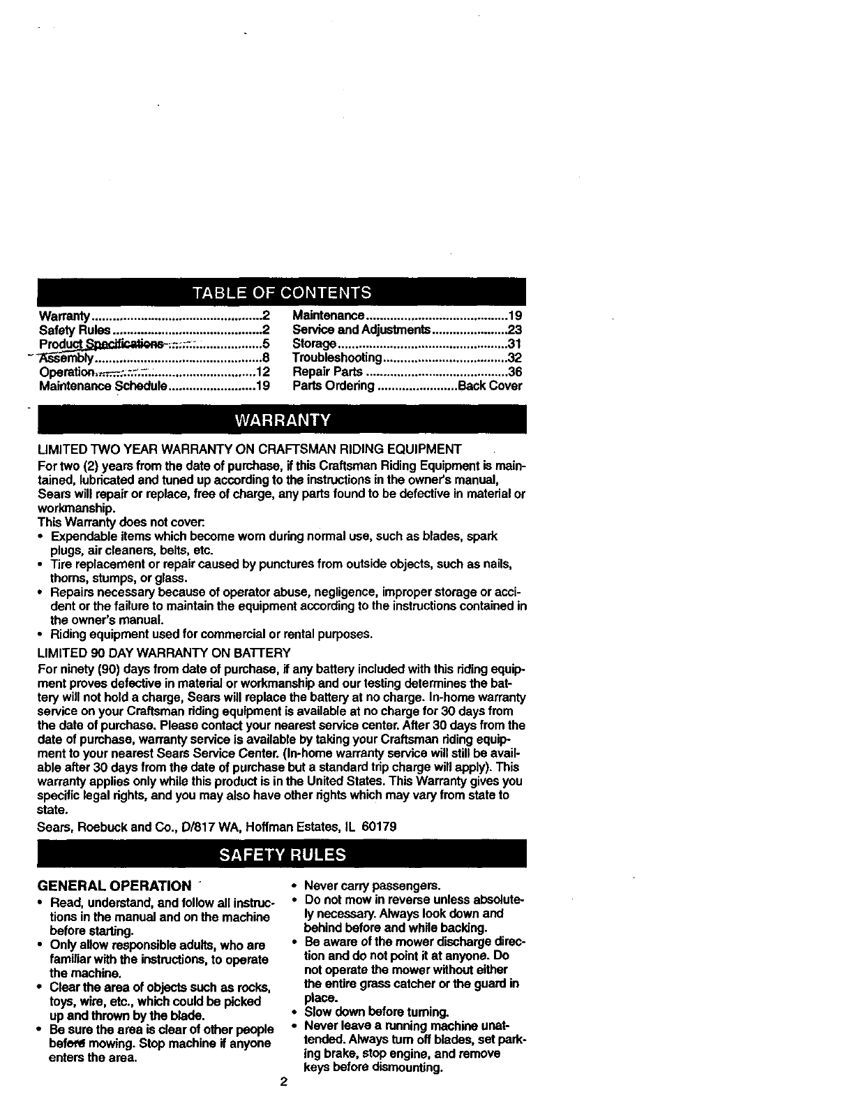 LIMITED TWO YEAR WARRANTY ON CRAFTSMAN RIDING EQUIPMENT