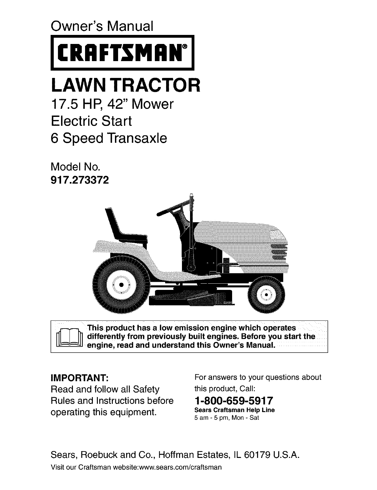 User Manual: Craftsman 917273372 917273372 CRAFTSMAN LAWN TRACTOR - Manuals and Guides View the owners manual for your CRAFTSMAN LAWN TRACTOR #917273372. Home:Lawn & Garden Parts:Craftsman Parts:Craftsman LAWN TRACTOR Manual