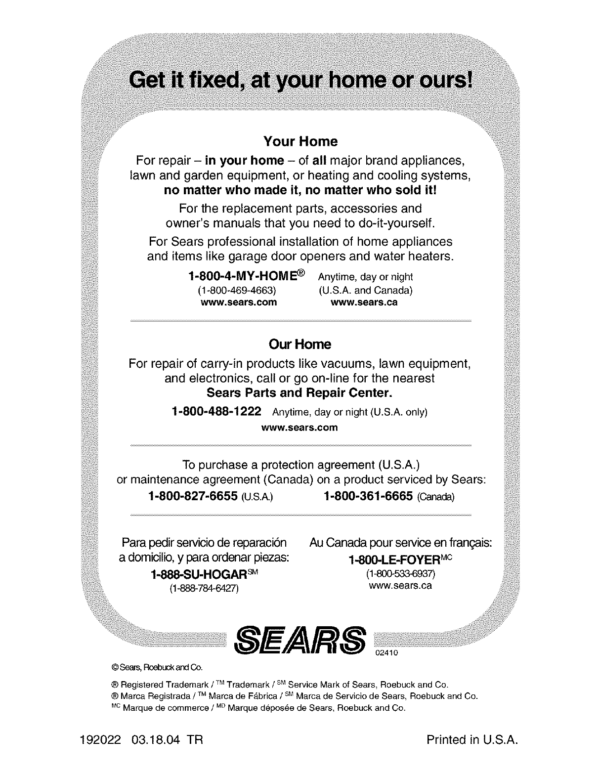 ® Registered Trademark /TMTrademark /SMService Mark of Sears, Roebuck and Co.