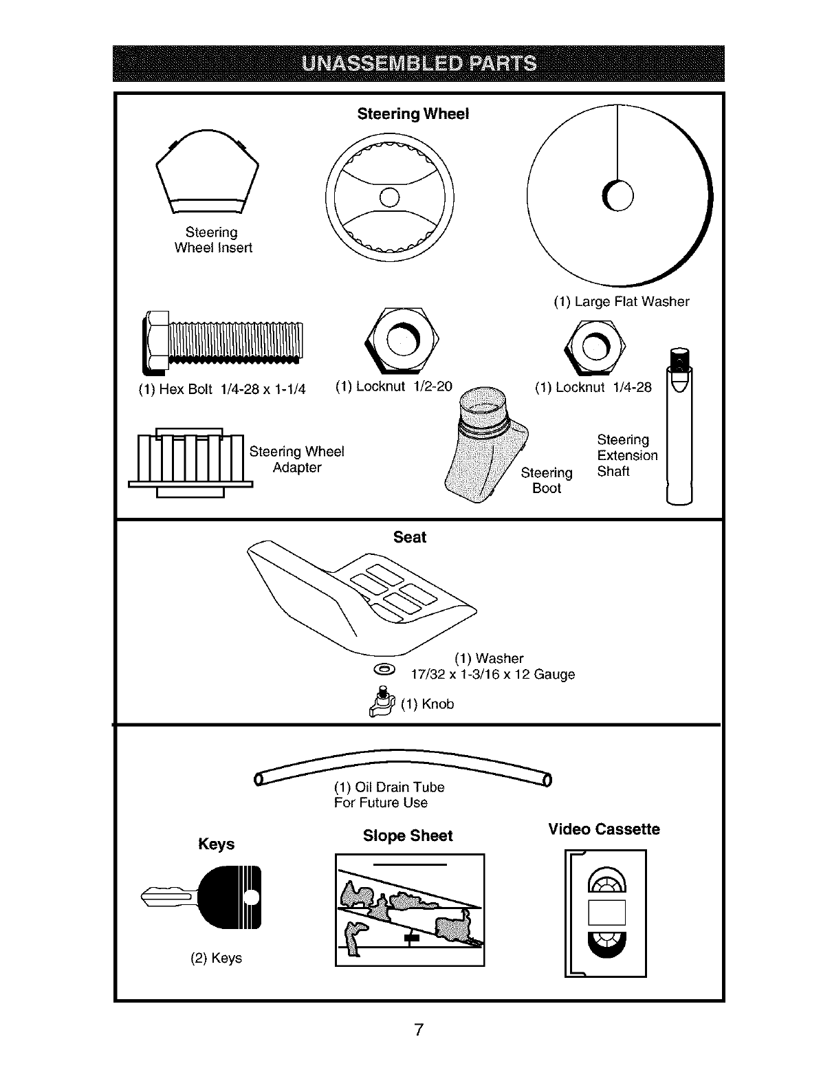 blades, spark plugs, air cleaners, belts, and oil filters.