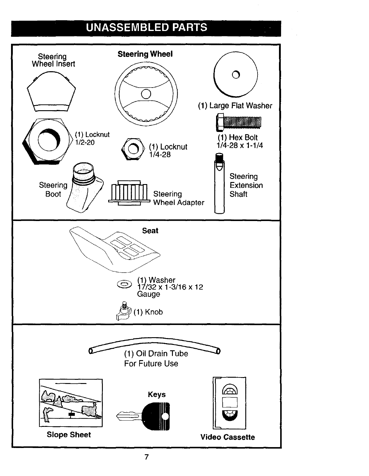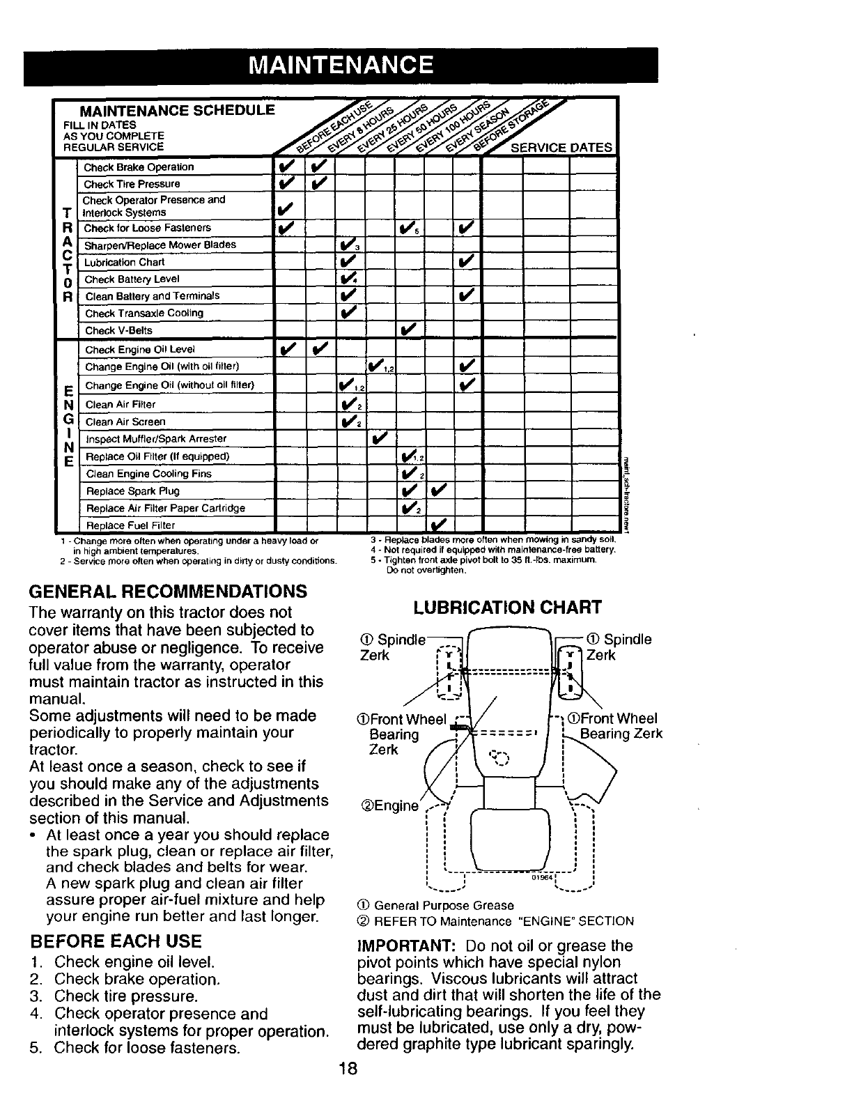 blades, spark plugs, air cleaners, belts, and oil filters.