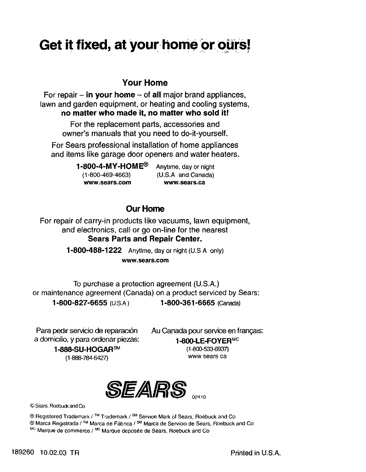 ®Regtstered Trademark /TMTrademark /SMService Mark of Sears, Roebuck and Co