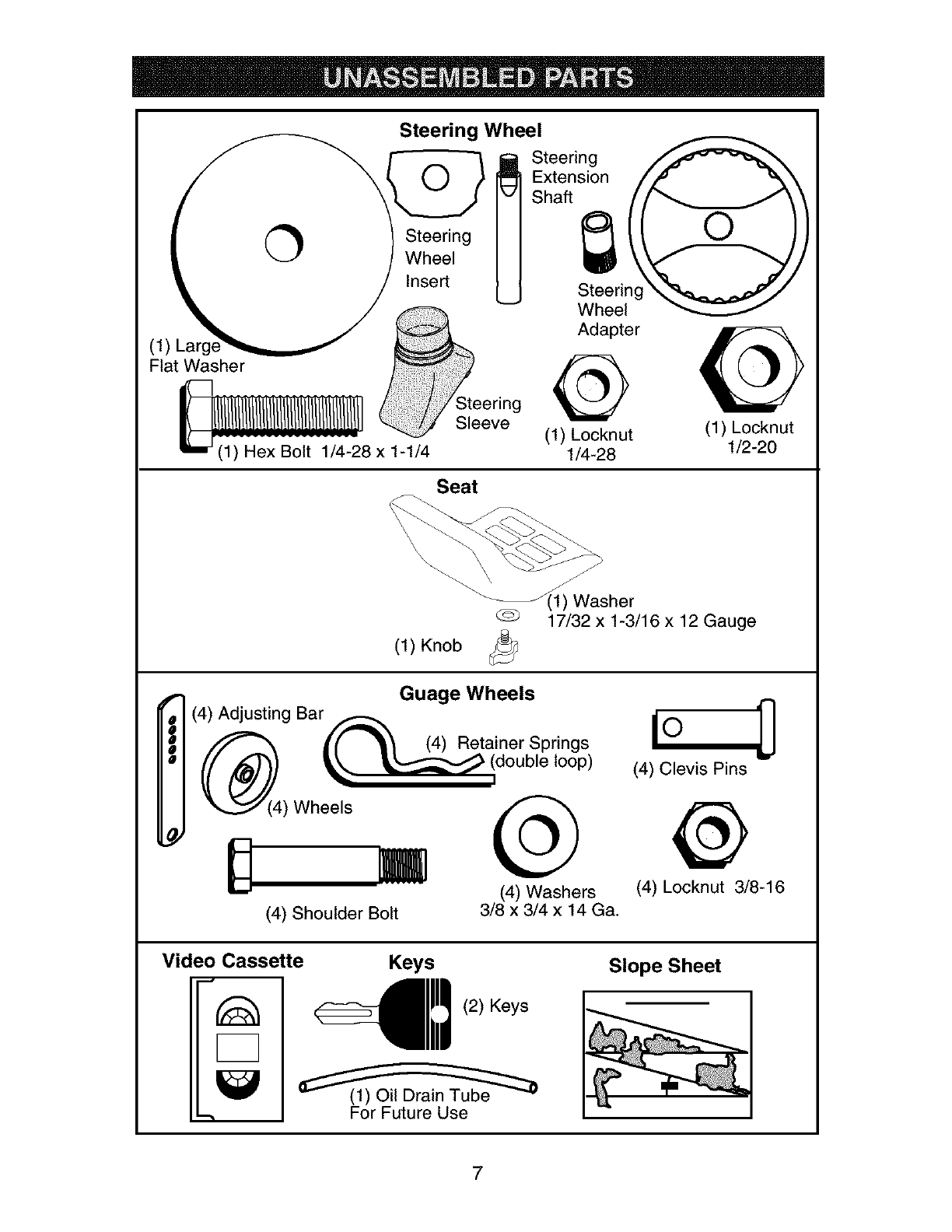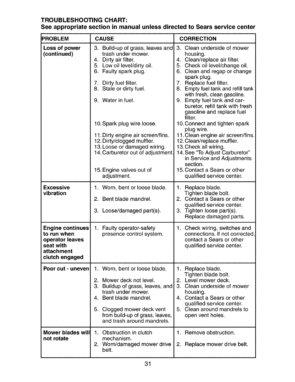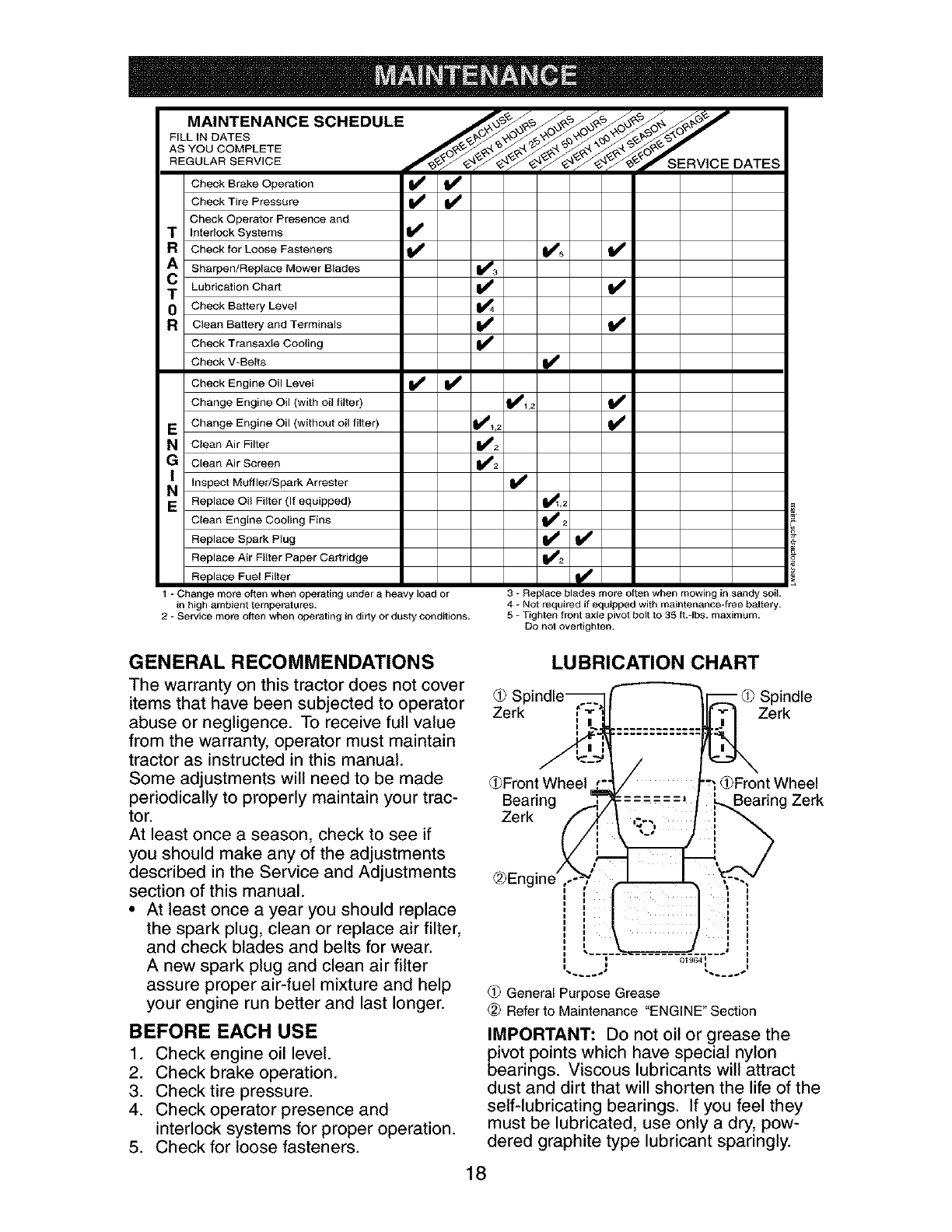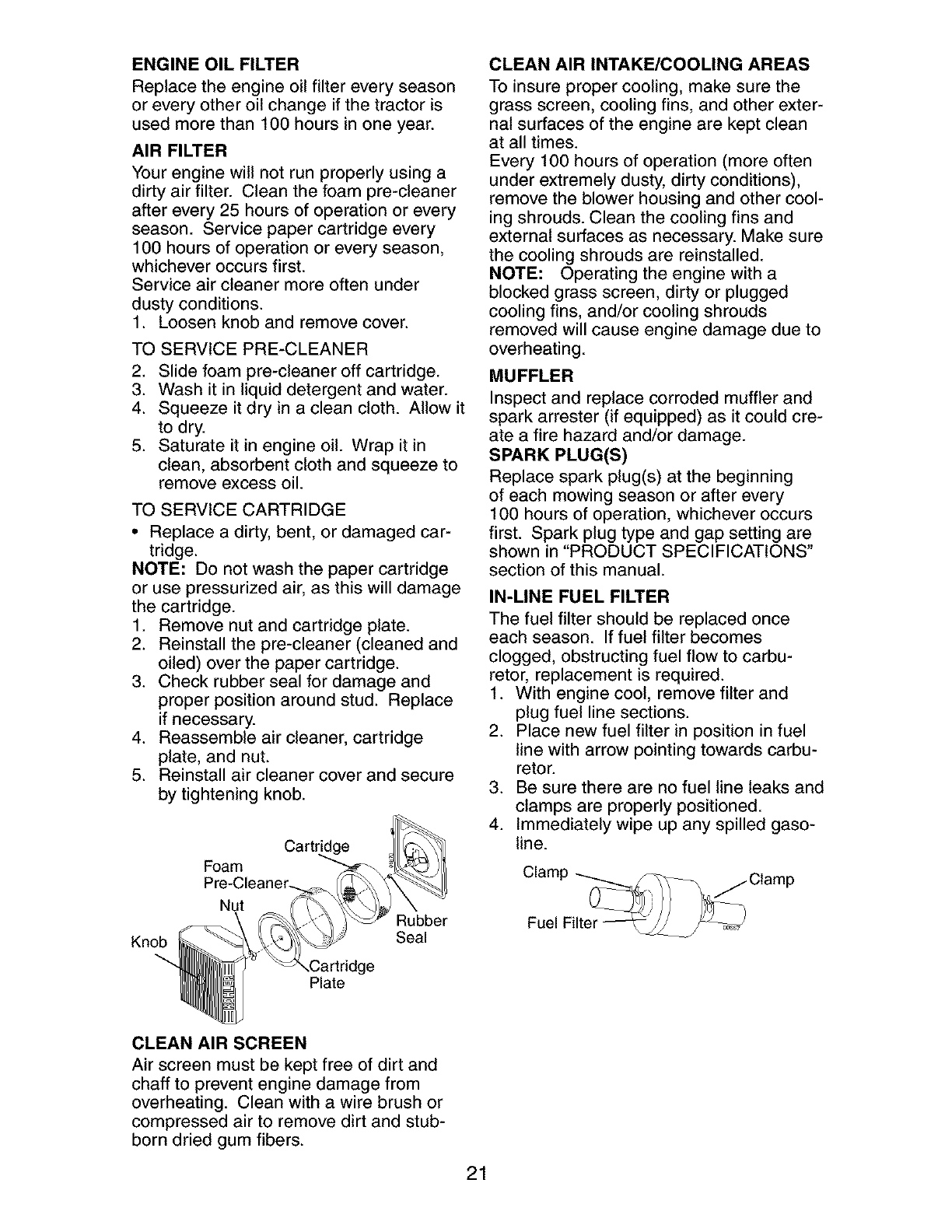 blades, spark plugs, air cleaners, belts, and oil filters.